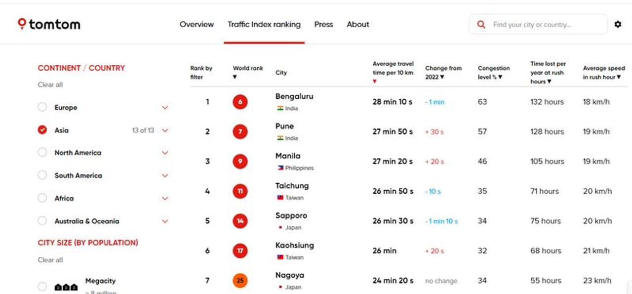 ಜಾಗತಿಕ ಮಟ್ಟದಲ್ಲಿ 2ರಿಂದ 6ನೇ ಸ್ಥಾನಕ್ಕೆ ಕುಸಿತ: ಟಾಮ್ಟಾಮ್ ಸಂಸ್ಥೆಯ ಪ್ರತಿನಿಧಿಗಳು 55 ದೇಶಗಳ 387 ನಗರಗಳಲ್ಲಿ ಅಧ್ಯಯನ ನಡೆಸಿ ವರದಿ ಸಿದ್ಧಪಡಿಸಿದ್ದಾರೆ. ಈ ಪೈಕಿ ಇಂಗ್ಲೆಂಡಿನ ಲಂಡನ್, ಐರ್ಲೆಂಡಿನ ಡಬ್ಲಿನ್ ಹಾಗೂ ಕೆನಡಾದ ಟೊರಂಟೊ, ಇಟಲಿಯ ಮಿಲನ್ ಹಾಗೂ ಪೆರು ದೇಶದ ಲಿಮಾ ನಗರಗಲು ಕ್ರಮವಾಗಿ ಪ್ರಥಮ, ದ್ವಿತೀಯ, ಮೂರನೇ, ನಾಲ್ಕನೇ ಹಾಗೂ ಐದನೇ ಸ್ಥಾನಗಳನ್ನು ಗಳಿಸಿವೆ. ಟಾಮ್ ಟಾಮ್ ಸಂಸ್ಥೆಯ ವರದಿಯಲ್ಲಿ 2022ರಲ್ಲಿ ವಿಶ್ವದ ನಗರಗಳ ಸಿಬಿಡಿ ವಿಭಾಗದ ಪಟ್ಟಿಯಲ್ಲಿ ಬೆಂಗಳೂರು 2ನೇ ಸ್ಥಾನದಲ್ಲಿತ್ತು. ಈ ಬಾರಿ 6ನೇ ಸ್ಥಾನಕ್ಕೆ ಬಂದಿದೆ. ಜೊತೆಗೆ, 2022ಕ್ಕೆ ಹೋಲಿಸಿದರೆ 2023ರಲ್ಲಿ ದಟ್ಟಣೆ ಸಂದರ್ಭದ ಪ್ರಯಾಣದ ಅವಧಿ 1 ನಿಮಿಷ ಕಡಿಮೆಯಾಗಿದೆ ಎಂದು ತಿಳಿಸಲಾಗಿದೆ.