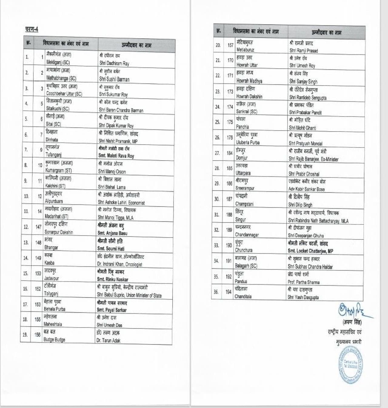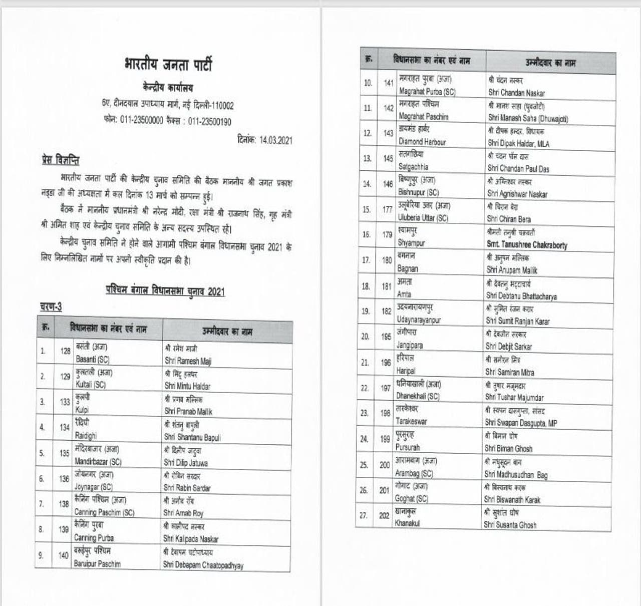 ಅಲಿಪುರ್ದೌರ್ ಕ್ಷೇತ್ರದಿಂದ ಅಶೋಲ್ ಲಾಹರಿ, ದಮ್ಜೂರಿನಿಂದ ರಜೀಬ್ ಬ್ಯಾನರ್ಜಿ, ತಾರಕೇಶ್ವರ್ ಕ್ಷೇತ್ರದಿಂದ ಸ್ವಪನ್ ದಾಸ್ಗುಪ್ತಾ, ದಿನಹತಾ ಕ್ಷೇತ್ರದಿಂದ ಸಂಸದ ನಿತೀಶ್ ಪ್ರಮಾಣಿಕ್ ಸ್ಪರ್ಧಿಸಲಿದ್ದಾರೆ ಎಂದು ಬಿಜೆಪಿ ಮುಖ್ಯ ಕಾರ್ಯದರ್ಶಿ ಅರುಣ್ ಸಿಂಗ್ ಹೇಳಿದ್ದಾರೆ.