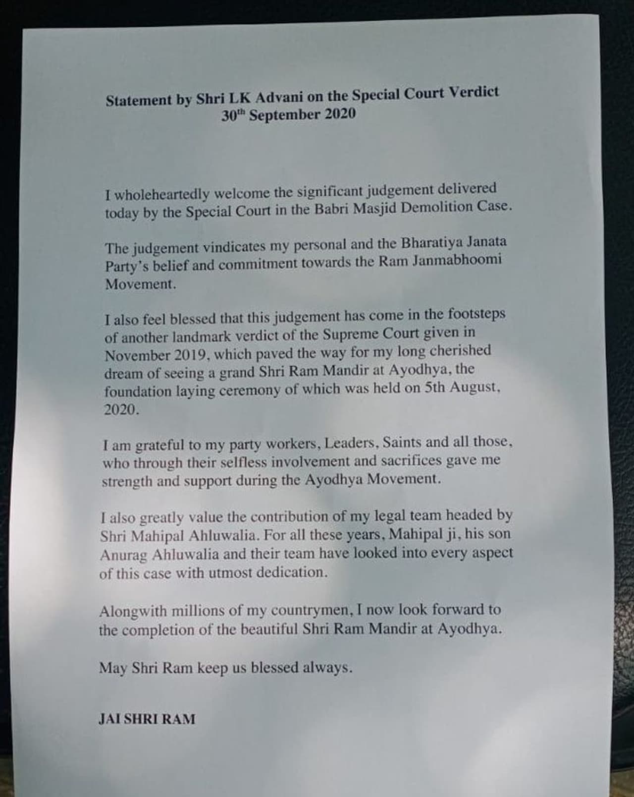 ನವದೆಹಲಿ(ಸೆ.30): ಬಾಬ್ರಿ ಮಸೀದಿ ಧ್ವಂಸ ಪ್ರಕರಣ ಸಂಬಂಧ ಲಕ್ನೋನ ವಿಶೇಷ ನ್ಯಾಯಾಲಯ ಇಂದು ಹೊರಡಿಸಿರುವ ತೀರ್ಪನ್ನು ನಾನು ಹೃತ್ಪೂರ್ವಕವಾಗಿ ಸ್ವಾಗತಿಸುತ್ತೇನೆ. ಈ ತೀರ್ಪಿನ ಮೂಲಕ ರಾಮ ಜನ್ಮಭೂಮಿ ಚಳುವಳಿ ಸಂಬಂಧ ನನ್ನ ಹಾಗೂ ಭಾರತೀಯ ಜನತಾ ಪಕ್ಷದ ವಿಶ್ವಾಸ ಹಾಗೂ ಬದ್ಧತೆಗೆ ಜಯ ಸಿಕ್ಕಂತಾಗಿದೆ ಎಂದಿದ್ದಾರೆ.