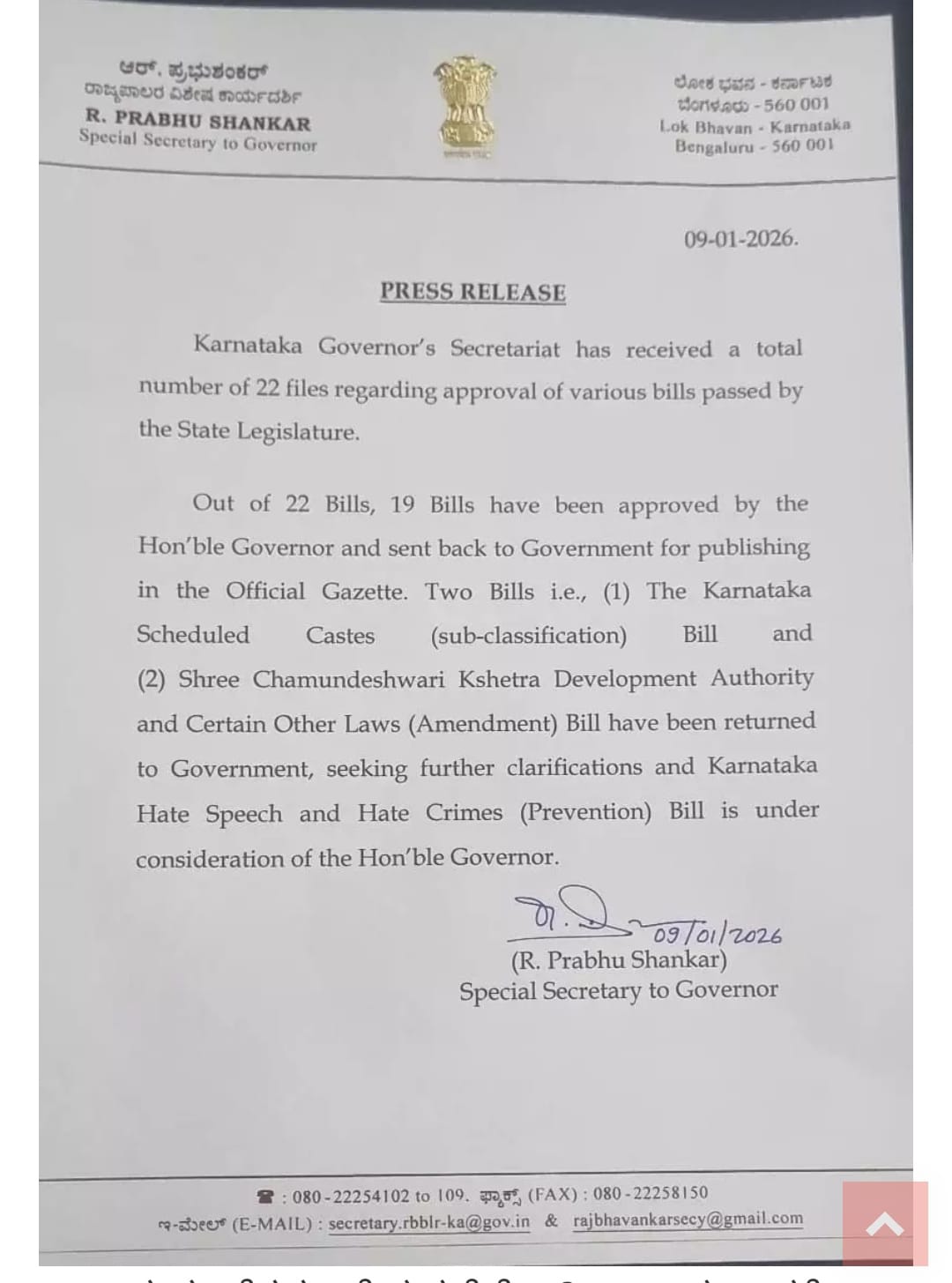 ಕರ್ನಾಟಕ ಅನುಸೂಚಿತ ಜಾತಿಗಳ ಉಪವರ್ಗೀಕರಣ ವಿಧೇಯಕಕ್ಕೆ ರಾಜ್ಯಪಾಲ ಥಾವರ್ ಚಂದ್ ಗೆಹಲೋತ್ ಅವರು ಅಂಕಿತ ಹಾಕಲು ನಿರಾಕರಿಸಿದ್ದು, ಹಲವು ಸ್ಪಷ್ಟನೆಗಳನ್ನು ಕೋರಿ ವಿಧೇಯಕವನ್ನು ಸರ್ಕಾರಕ್ಕೆ ವಾಪಸ್ ಕಳುಹಿಸಿದ್ದಾರೆ. ಇದರಿಂದಾಗಿ ರಾಜ್ಯ ಸರ್ಕಾರದ ಒಳಮೀಸಲಾತಿ ಜಾರಿಯ ಆಶಯಕ್ಕೆ ತಾತ್ಕಾಲಿಕ ಧಕ್ಕೆ ಉಂಟಾಗಿದೆ. ನ್ಯಾಯಮೂರ್ತಿ ನಾಗಮೋಹನ್ ದಾಸ್ ಆಯೋಗದ ಶಿಫಾರಸ್ಸಿನಂತೆ ಶೇ. 6, 6 ಮತ್ತು 5ರ ಅನುಪಾತದಲ್ಲಿ ಕೋಟಾ ನಿಗದಿಪಡಿಸಲಾಗಿತ್ತು, ಆದರೆ ರಾಜ್ಯಪಾಲರು ಜನವರಿ 9 ರಂದೇ ಈ ಫೈಲ್ ವಾಪಸ್ ಕಳುಹಿಸಿದ್ದಾರೆ.