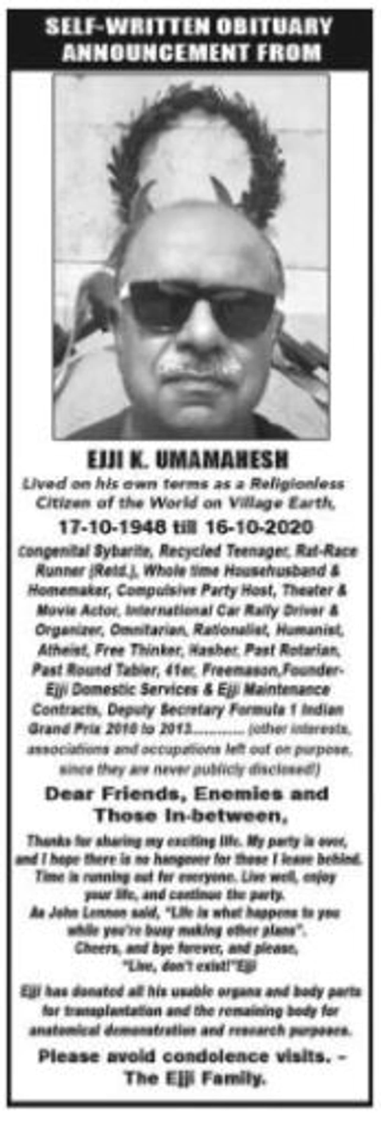 ತಮಿಳುನಾಡು ಮೂಲದ ಎಜ್ಜಿ ಕೆ. ಉಮಾಮಹೇಶ್(72) ಎಂಬುವರು ಅ. 10ರಂದು ವಿಧಿವಶರಾಗಿದ್ದು, ತಮ್ಮ ಇಹಲೋಕದ ಪಯಣ ಮುಗಿಸುವ ಮುನ್ನವೇ ತಮ್ಮ ನಿಧನ ವಾರ್ತೆಯನ್ನು ಖುದ್ದು ತಾವೇ ಬರೆದು, ತಾವು ಸತ್ತ ಬಳಿಕ ಏನೆಲ್ಲಾ ಮಾಡಬೇಕು ಎಂಬುದರ ವಿವರಣೆ ನೀಡಿದ್ದಾರೆ.