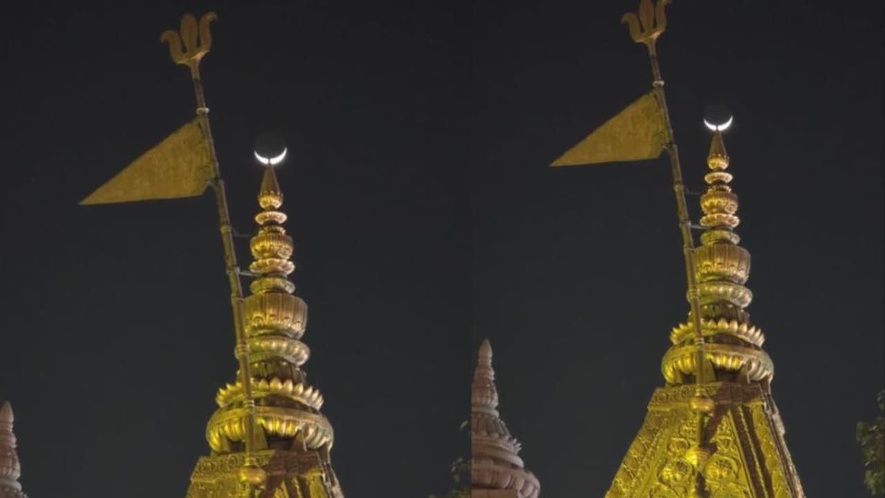 ಹೌದು ಕಾಶಿ ವಿಶ್ವನಾಥ ದೇವಾಲಯದ ಶಿಖರದ ಮೇಲೆ ನೇರವಾಗಿ ಕುಳಿತಿರುವ ಚಂದ್ರನ ಕಣ್ಮನ ಸೆಳೆಯುವ ಚಿತ್ರವೊಂದು ಆನ್ಲೈನ್ನಲ್ಲಿ ವೈರಲ್ ಆಗಿದೆ. ಕಾಶಿ ವಿಶ್ವನಾಥ ದೇವಾಲಯದ ಮೇಲ್ಭಾಗದಲ್ಲಿ ಅರ್ಧಚಂದ್ರ ಕಾಣಿಸಿಕೊಂಡಿದ್ದು, ಇದು ಹಿಂದೆಂದು ಕಾಣದ ಅದ್ಭುತ ದೃಶ್ಯವಾಗಿ ಬದಲಾಗಿದೆ . ಈ ದೇವಾಲಯವು ಕಾಸ್ಮಿಕ್ ಸಂಕೇತಗಳೊಂದಿಗೆ ಆಳವಾದ ಸಂಪರ್ಕವನ್ನು ಹೊಂದಿದೆ. ಹೀಗಾಗಿ ಈ ದೃಶ್ಯ ಭಕ್ತರಿಗೆ ಅಪರೂಪದ ಆಕಾಶ ಜೋಡಣೆಯನ್ನು ಇನ್ನಷ್ಟು ಅರ್ಥಪೂರ್ಣವಾಗಿಸಿದೆ. ಅರ್ಧಚಂದ್ರನನ್ನು ಹೆಚ್ಚಾಗಿ ಶಿವನೊಂದಿಗೆ ಕಾಣಬಹುದು. ಶಿವನು ಚಂದ್ರನನ್ನು ತನ್ನ ಜಡೆಯಲ್ಲಿ ಅಲಂಕರಿಸಿರುವುದನ್ನು ನೋಡಬಹುದು. ಹೀಗಾಗಿ ಕಾಶಿ ವಿಶ್ವನಾಥನ ದೇಗುಲದ ಕಳಶದ ಮೇಲೆ ನೆಲೆ ನಿಂತ ಚಂದ್ರನ ಅಪರೂಪದ ದೃಶ್ಯವು ಭಕ್ತರಲ್ಲಿ ಆಧ್ಮಾತ್ಮಿಕವಾದ ಚಿಂತನೆಗೆ ಕಾರಣವಾಗಿದೆ.