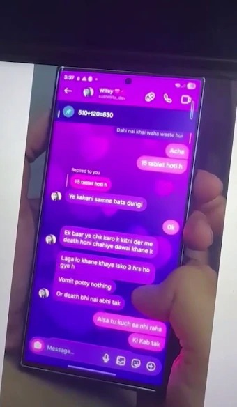 ಒಂದು ಚಾಟ್ ಸಂದೇಶದಲ್ಲಿ, ರಾಹುಲ್ಗೆ ಪ್ರಶ್ನೆ ಮಾಡಿರುವ ಸುಶ್ಮಿತಾ , "ಔಷಧಿ ತೆಗೆದುಕೊಂಡ ನಂತರ ಸಾಯಲು ಎಷ್ಟು ಸಮಯ ತೆಗೆದುಕೊಳ್ಳುತ್ತದೆ ಎಂದು ನೋಡಿ. ಅವನು ತಿಂದು ಮೂರು ಗಂಟೆಗಳಾಗಿವೆ, ಆದರೆ ವಾಂತಿ ಇಲ್ಲ, ಮಲ ವಿಸರ್ಜನೆಯೂ ಆಗಿಲ್ಲ, ಏನೂ ಇಲ್ಲ. ಮತ್ತು ಅವನು ಇನ್ನೂ ಸತ್ತಿಲ್ಲ" ಎಂದು ಬರೆದಿದ್ದಾರೆ.