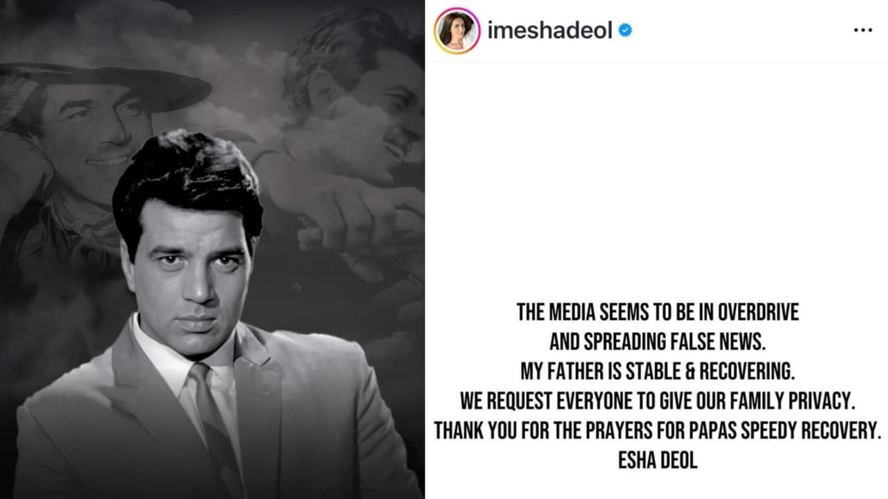 ಸೋಶಿಯಲ್ ಮೀಡಿಯಾ ಪೋಸ್ಟ್ನಲ್ಲಿ ಬರೆದಿರುವ ಇಶಾ ಡಿಯೋಲ್, 'ಮಾಧ್ಯಮಗಳು ಸಂಪೂರ್ಣ ಸುಳ್ಳು ಸುದ್ದಿಗಳನ್ನು ಹರಡುತ್ತಿವೆ. ಅಪ್ಪನ ಆರೋಗ್ಯ ಸ್ಥಿರವಾಗಿದ್ದು, ಚೇತರಿಸಿಕೊಳ್ಳುತ್ತಿದ್ದಾರೆ. ನಮ್ಮ ಕುಟುಂಬದ ಗೌಪ್ಯತೆಯನ್ನು ಎಲ್ಲರೂ ಗೌರವಿಸಬೇಕೆಂದು ನಾವು ವಿನಂತಿಸುತ್ತೇವೆ. ಅಪ್ಪನ ಶೀಘ್ರ ಚೇತರಿಕೆಗಾಗಿ ನಿಮ್ಮ ಪ್ರಾರ್ಥನೆಗೆ ಧನ್ಯವಾದಗಳು' ಎಂದು ಬರೆದುಕೊಂಡಿದ್ದಾರೆ.