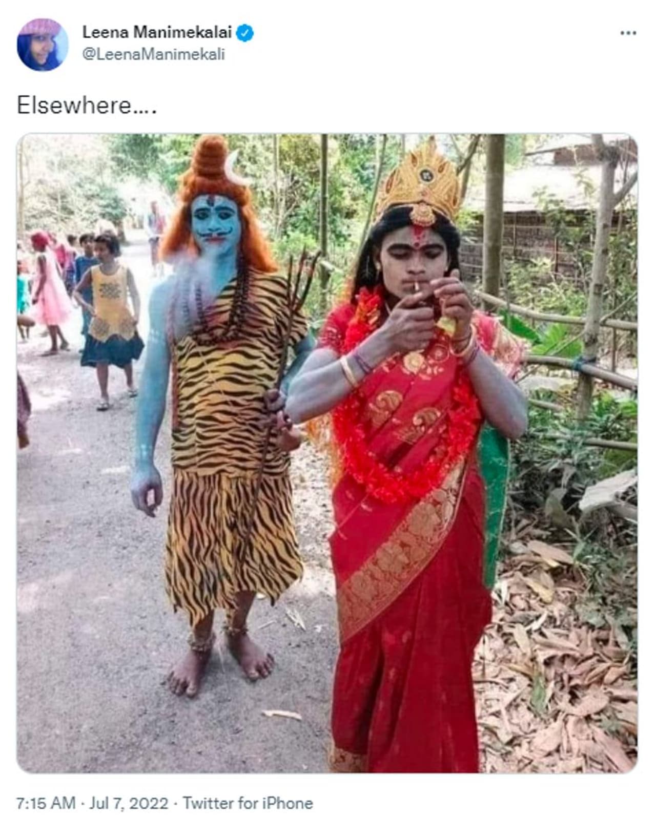ಫೋಟೋವನ್ನು ಟ್ವೀಟ್ ಮಾಡಿದ ಲೀನಾ ಮಣಿಮೇಕಲೈ, 'ಸಮ್ವೇರ್ ಎಲ್ಸ್' ಎಂದು ಬರೆದಿದ್ದಾರೆ. ಈ ಕುರಿತು ನೆಟಿಜನ್ಸ್ಗಳು ಆಕ್ರೋಶ ಹೊರಹಾಕಿದ್ದಾರೆ. ಈಕೆ ಕೇವಲ ದ್ವೇಷವನ್ನು ಹರಡುತ್ತಿದ್ದಾಳೆ ಎಂದು ಟೀಕಿಸಿದ್ದಾರೆ. ಧರ್ಮವನ್ನು ಅವಮಾನಿಸುವ ಇಂಥ ಕೆಲಸಗಳನ್ನು ನಿಲ್ಲಿಸಬೇಕು ಎಂದು ಬರೆದಿದ್ದಾರೆ.
