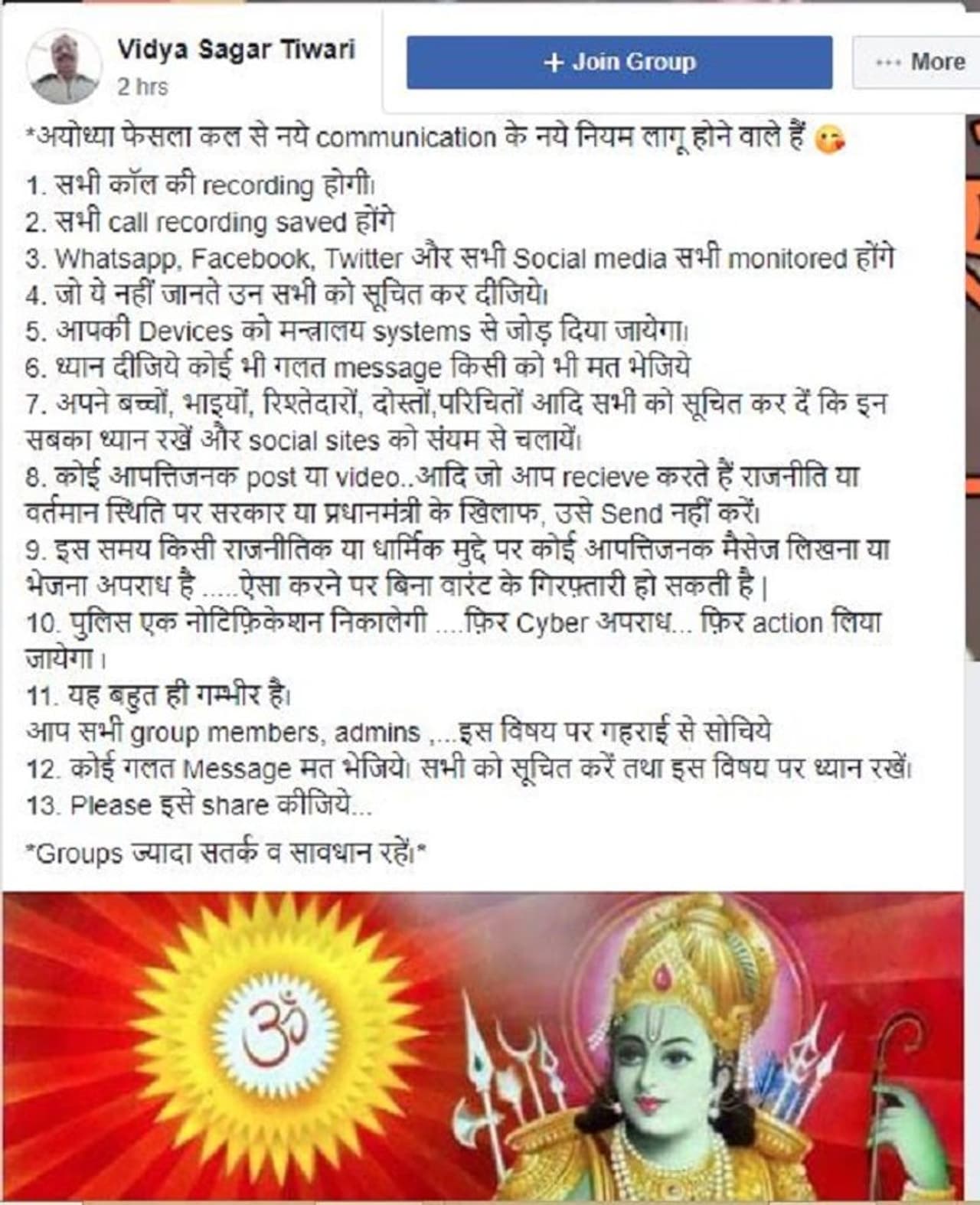 ಸದ್ಯ ಅಯೋಧ್ಯೆ ವಿವಾದ ಸಂಬಂಧ ಸುಪ್ರೀಂಕೋರ್ಟ್ ಇನ್ನೇನು ತೀರ್ಪು ನೀಡಲಿರುವುದರಿಂದ ಅಯೋಧ್ಯೆ ಪೊಲೀಸರು ವಾಟ್ಸ್ಆ್ಯಪ್, ಫೇಸ್ಬುಕ್, ಟ್ವೀಟರ್ ಸೇರಿದಂತೆ ಎಲ್ಲಾ ಸೋಷಿಯಲ್ ಮೀಡಿಯಾ ಮೂಲಕ ಕಳುಹಿಸುವ ಸಂದೇಶಗಳ ಮೇಲೆ ಕಣ್ಣಿಟ್ಟಿದ್ದಾರೆ ಎನ್ನುವ ಸಂದೇಶವೊಂದು ವೈರಲ್ ಆಗುತ್ತಿದೆ. ನಿಜನಾ ಈ ಸುದ್ದಿ? ಏನಿದರ ಸತ್ಯಾಸತ್ಯತೆ?