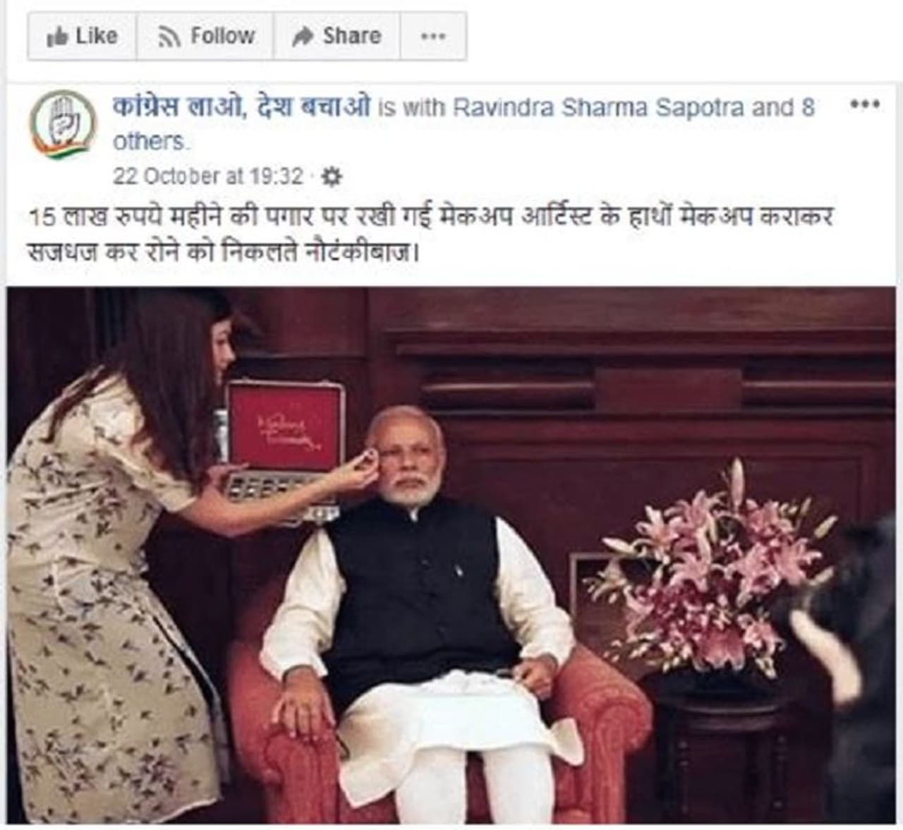 ಸಾಮಾಜಿಕ ಜಾಲತಾಣಗಳಲ್ಲಿ ವೈರಲ್ ಆಗಿರುವ ಈ ಫೋಟೋದಲ್ಲಿ ಮಹಿಳೆಯೊಬ್ಬರು ಮೋದಿ ಅವರಿಗೆ ಮೇಕಪ್ ಮಾಡುತ್ತಿರುವಂತೆ ಕಾಣಿಸುತ್ತದೆ. ಮೋದಿ ಅವರು ಈ ಹಿಂದೆ ಅಮೆರಿಕ ಅಧ್ಯಕ್ಷರ ಭೇಟಿ ವೇಳೆ 10 ಲಕ್ಷದ ಸೂಟು ಧರಿಸಿದ್ದರು ಎಂದು ಸುದ್ದಿಯಾಗಿತ್ತು. ಹೀಗಾಗಿ ಮೋದಿ ಅವರು ಕಾರ್ಯಕ್ರಮದ ವೇಳೆ ವಿವಿಧ ರೀತಿಯ ವೇಷಭೂಷಣ ಧರಿಸಿರುವ ಫೋಟೋಗಳನ್ನು ಹಾಕಿ ಟೀಕಾಕಾರರು ಕಮೆಂಟ್ ಮಾಡುತ್ತಿದ್ದಾರೆ.