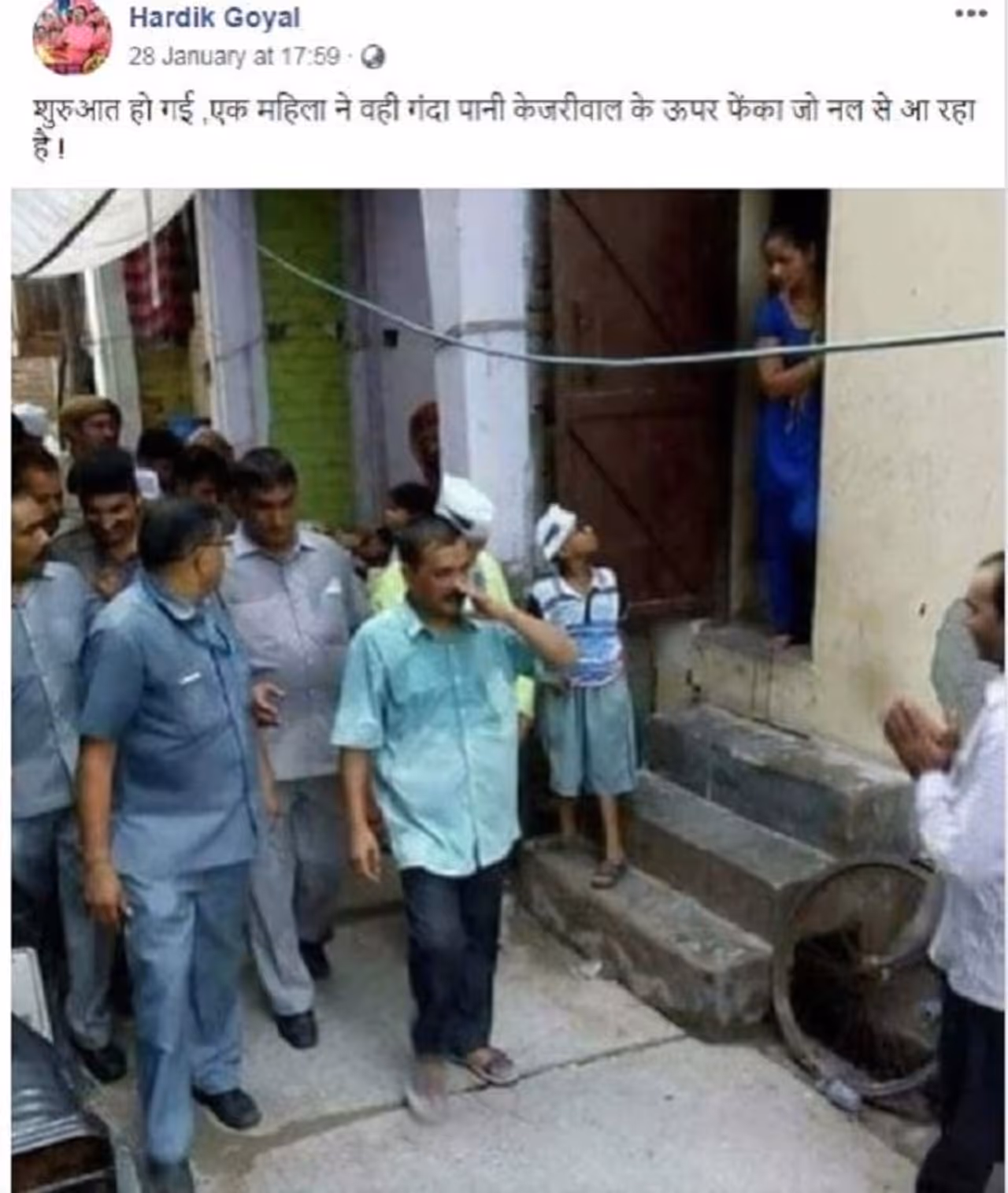 ಹಾರ್ದಿಕ್ ಗೋಯಲ್ ಎನ್ನುವ ಫೇಸ್ಬುಕ್ ಬಳಕೆದಾರರು ಇದನ್ನು ಪೋಸ್ಟ್ ಮಾಡಿ, ‘ಮಹಿಳೆಯೊಬ್ಬರು ಕೇಜ್ರಿವಾಲ್ ಮೇಲೆ ಕೊಳಕು ನೀರು ಚೆಲ್ಲಿದ್ದಾರೆ. ಇದು ಇನ್ನೂ ಆರಂಭ ಅಷ್ಟೇ’ ಎಂದು ಬರೆದುಕೊಂಡಿದ್ದಾರೆ.