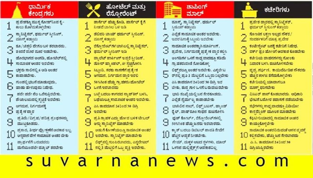 ಪ್ರವೇಶ ದ್ವಾರದಲ್ಲಿ ಥರ್ಮಲ್ ಸ್ಕ್ರೀನಿಂಗ್, ಹ್ಯಾಂಡ್ ಸ್ಯಾನಿಟೈಸರ್ ಬಳಕೆ, ಸಾಮಾಜಿಕ ಅಂತರ ಪಾಲನೆಗಳಿಗೆ ಈ ಮಾರ್ಗಸೂಚಿಯಲ್ಲಿ ಒತ್ತು ನೀಡಲಾಗಿದೆ. ಕಚೇರಿಗಳಿಗೂ ಮಾರ್ಗಸೂಚಿಯಲ್ಲಿ ಹಲವು ಸಲಹೆಗಳನ್ನು ನೀಡಲಾಗಿದೆ.