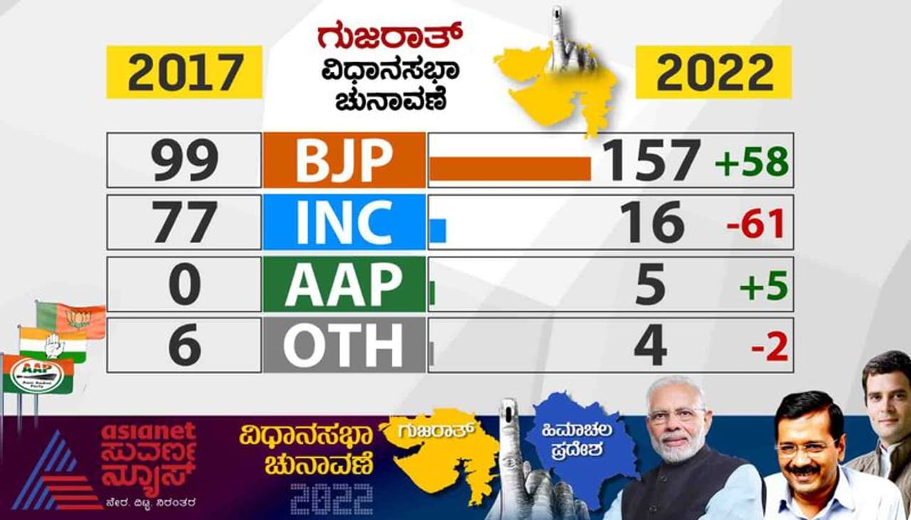 ನಿರೀಕ್ಷೆಯಂತೆ ಬಿಜೆಪಿ ಗುಜರಾತಿನಲ್ಲಿ ಗೆಲುವಿನ ನಗೆ ಬೀರಿದೆ. ಆಪ್ ನಿರೀಕ್ಷೆಯಷ್ಟು ಕ್ಷೇತ್ರಗಳನ್ನು ಗೆಲ್ಲುವಲ್ಲಿ ವಿಫಲವಾಗಿದ್ದರೂ, 5 ಕ್ಷೇತ್ರಗಳನ್ನು ಗೆದ್ದು, ಜಯದ ನಗೆ ಬೀರಿದೆ. ಆದರೆ, ಕಾಂಗ್ರೆಸ್ ಮಾತ್ರ 61 ಸ್ಥಾನಗಳನ್ನು ಕಳೆದು ಕೊಳ್ಳುವ ಮೂಲಕ ನೆಲ ಕಚ್ಚಿದೆ. ಆಪ್ ಬಂದು ಪಕ್ಷದ ಸ್ಥಾನಗಳನ್ನು ಕಸಿದುಕೊಂಡಿದೆ ಎಂದು ಗೋಳಿಡುತ್ತಿದೆ ಕೈ. ರಾಹುಲ್ ಗಾಂಧಿ ಭಾರತ್ ಜೋಡೋ ಯಾತ್ರೆ ನೆಪದಲ್ಲಿ ಕೇವಲ ಎರಡು ರೋಡ್ ಶೋ ಹಮ್ಮಿಕೊಂಡಿದ್ದರೆ, ಪ್ರಧಾನಿ ನರೇಂದ್ರ ಮೋದಿ ನಿರಂತರವಾಗಿ 30ಕ್ಕೂ ಹೆಚ್ಚು ರೋಡ್ ಶೋ ಮಾಡಿದ್ದು, ಹಳ್ಳಿ ಹಳ್ಳಿಗೂ ಕಾಲಿಟ್ಟಿದ್ದು ಕಮಲದ ಗೆಲುವಿಗೆ ಮುಖ್ಯ ಕಾರಣವೆಂದು ವಿಶ್ಲೇಷಿಸಲಾಗುತ್ತಿದೆ.