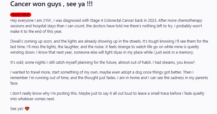 ನಾಲ್ಕನೇ ಹಂತದ ಕರುಳಿನ ಕ್ಯಾನ್ಸರ್ನಿಂದ ಬಳಲುತ್ತಿರುವ 21 ವರ್ಷದ ಯುವಕನೋರ್ವ, ತಾನು ಇನ್ನು ಹೆಚ್ಚು ಕಾಲ ಬದುಕುಳಿಯುವುದಿಲ್ಲ ಎಂದು ತಿಳಿದು ಸಾಮಾಜಿಕ ಜಾಲತಾಣದಲ್ಲಿ ಭಾವುಕ ಪೋಸ್ಟ್ ಹಂಚಿಕೊಂಡಿದ್ದು, ಈ ಪೋಸ್ಟ್ ಈಗ ಭಾರಿ ವೈರಲ್ ಆಗಿದೆ.