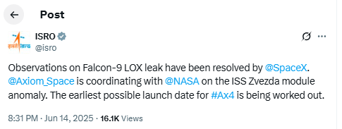 "ಇಸ್ರೋ, ಆಕ್ಸಿಯಮ್ ಸ್ಪೇಸ್ ಮತ್ತು ಸ್ಪೇಸ್ಎಕ್ಸ್ ನಡುವಿನ ಸಮನ್ವಯ ಸಭೆಯಲ್ಲಿ, ಫಾಲ್ಕನ್ 9 ಉಡಾವಣಾ ವಾಹನದಲ್ಲಿ ಕಂಡುಬಂದ ದ್ರವ ಆಮ್ಲಜನಕ ಸೋರಿಕೆಯನ್ನು ಯಶಸ್ವಿಯಾಗಿ ಪರಿಹರಿಸಲಾಗಿದೆ ಎಂದು ದೃಢಪಡಿಸಲಾಯಿತು" ಎಂದು ಇಸ್ರೋ ಇಂದು ತಿಳಿಸಿದೆ.