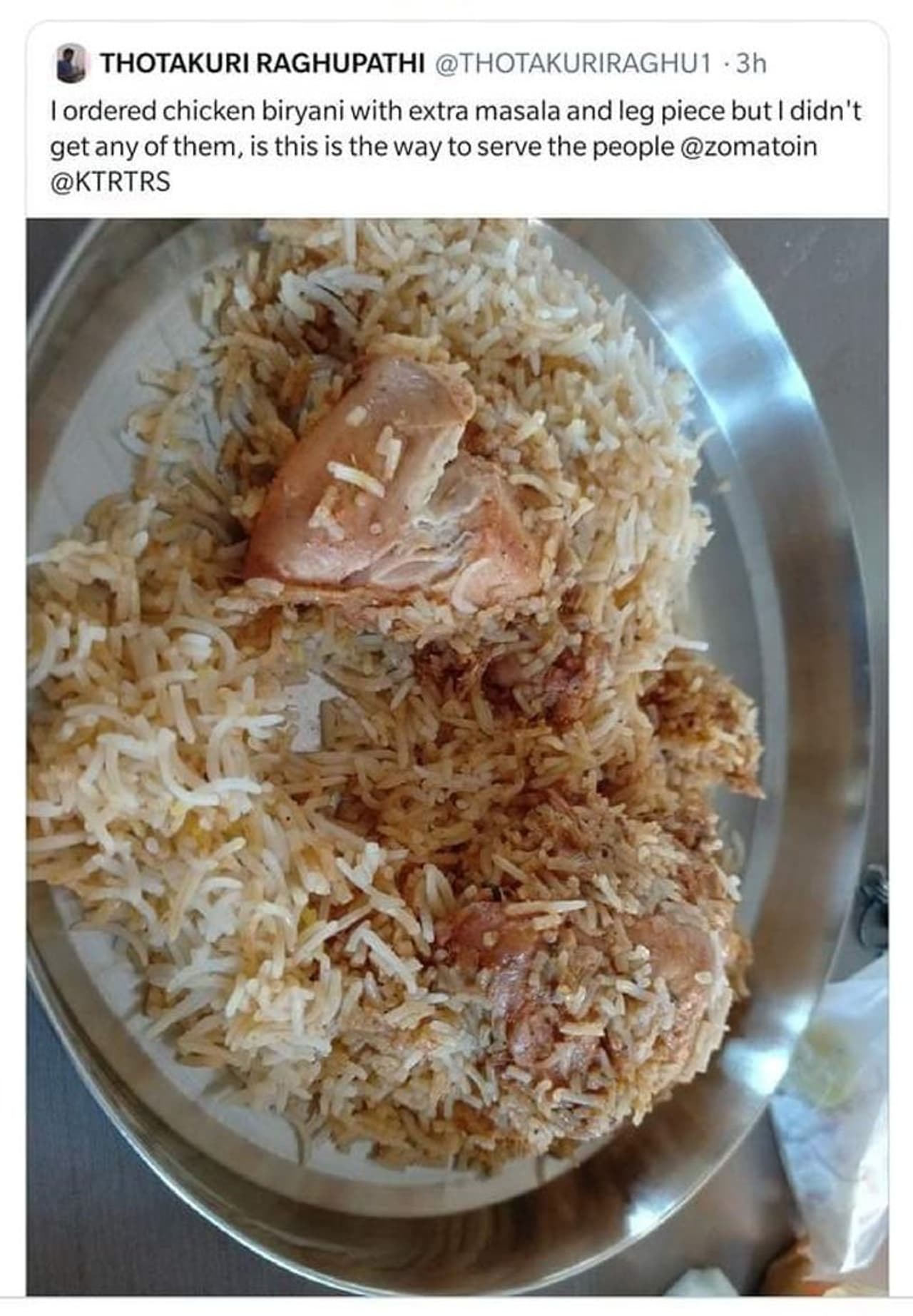 ರಘುಪತಿ ಜೋಮ್ಯಾಟೋ ಮೂಲಕ ಚಿಕನ್ ಬಿರಿಯಾನಿ ಆರ್ಡರ್ ಮಾಡಿದ್ದಾರೆ. ಆರ್ಡರ್ ವೇಳೆ ಹೆಚ್ಚುವರಿ ಲೆಗ್ಪೀಸ್ ಹಾಗೂ ಮಸಾಲಾಗೆ ಆರ್ಡರ್ ಮಾಡಿದ್ದಾರೆ. ಆದರೆ ಜೋಮ್ಯಾಟೋ ನೀಡಿದ ಬಿರಿಯಾನಿಯಲ್ಲಿ ಹೆಚ್ಚುವರಿ ಲೆಗ್ಪೀಸ್, ಮಸಾಲ ಇರಲಿಲ್ಲ. ಕೋಪಗೊಂಡ ರಘುುಪತಿ ಟ್ವಿಟರ್ ಮೂಲಕ ದೂರು ನೀಡಿದ್ದಾರೆ. ದೂರಿನಲ್ಲಿ ಜೋಮ್ಯಾಟೋ ಜೊತೆಗೆ ಕೆಟಿ ರಾಮ ರಾವ್ ಅವರಿಗೂ ದೂರು ನೀಡಿದ್ದಾನೆ.
