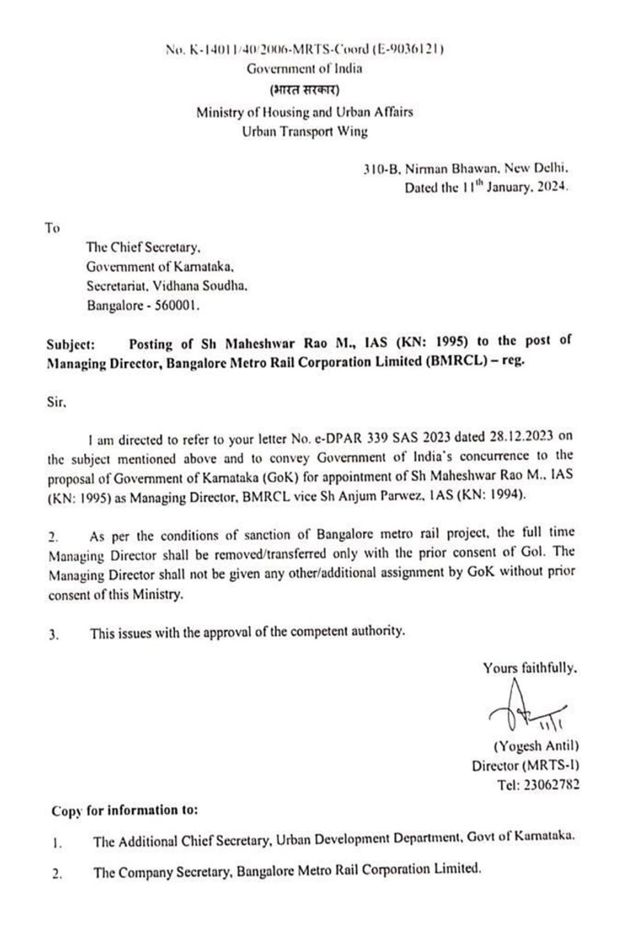 ಬೆಂಗಳೂರು ಮೆಟ್ರೋ ರೈಲು ಯೋಜನೆಯ ಮಂಜೂರಾತಿ ಷರತ್ತುಗಳ ಪ್ರಕಾರ, ಪೂರ್ಣ ಸಮಯದ ವ್ಯವಸ್ಥಾಪಕ ನಿರ್ದೇಶಕರನ್ನು ಕೇಂದ್ರ ಸರ್ಕಾರ ಪೂರ್ವ ಒಪ್ಪಿಗೆಯೊಂದಿಗೆ ಮಾತ್ರ ವರ್ಗಾಯಿಸಲಾಗುತ್ತದೆ. ಈ ಸಚಿವಾಲಯದ ಪೂರ್ವಾನುಮತಿಯಿಲ್ಲದೆ, ವ್ಯವಸ್ಥಾಪಕ ನಿರ್ದೇಶಕರಿಗೆ ಯಾವುದೇ ಇತರ/ಹೆಚ್ಚುವರಿ ನಿಯೋಜನೆಯನ್ನು ಕರ್ನಾಟಕ ರಾಜ್ಯ ಸರ್ಕಾರರವು ನೀಡುವಂತಿಲ್ಲ ಎಂದು ಆದೇಶ ಹೊರಡಿಸಲಾಗಿದೆ.