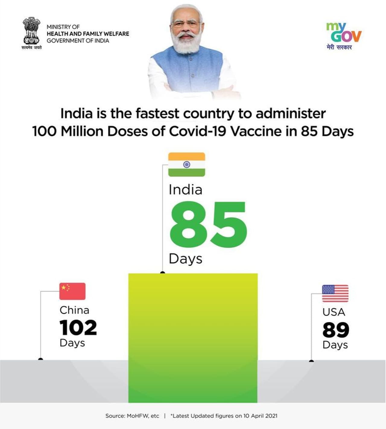 ಭಾರತ ಕೇವಲ 85 ದಿನದಲ್ಲಿ 100 ಮಿಲಿಯನ್(10 ಕೋಟಿ) ಕೊರೋನಾ ಡೊಸೇಜ್ ನೀಡಿದೆ. ಚೀನಾ ಈ ಸಂಖ್ಯೆ ತಲುಪಲು 102 ದಿನ ತೆಗೆದುಕೊಂಡಿತ್ತು. ಇನ್ನು ಅಮೆರಿಕ 100 ಮಿಲಿಯನ್ ಡೊಸೇಜ್ ನೀಡಲು 89 ದಿನ ತೆಗೆದುಕೊಂಡಿದೆ. ಈ ಮೂಲಕ ಭಾರತ ಅತೀ ವೇಗದಲ್ಲಿ ಕೊರೋನಾ ಲಸಿಕೆಯನ್ನು ಜನರಿಗೆ ನೀಡುತ್ತಿರುವ ದೇಶ ಅನ್ನೋ ಹೆಗ್ಗಳಿಕೆಗೆ ಪಾತ್ರವಾಗಿದೆ.