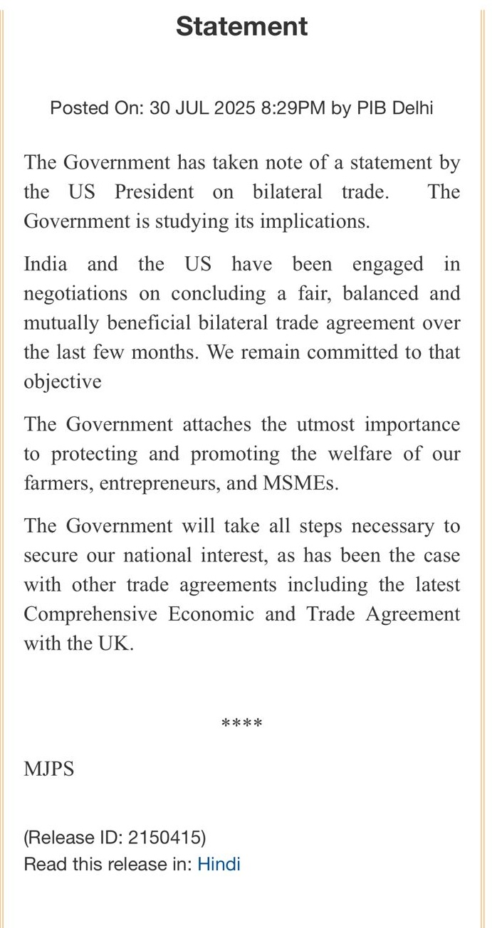 "ಕಳೆದ ಕೆಲವು ತಿಂಗಳುಗಳಿಂದ ಭಾರತ ಮತ್ತು ಅಮೆರಿಕ ನ್ಯಾಯಯುತ, ಸಮತೋಲಿತ ಮತ್ತು ಪರಸ್ಪರ ಪ್ರಯೋಜನಕಾರಿ ದ್ವಿಪಕ್ಷೀಯ ವ್ಯಾಪಾರ ಒಪ್ಪಂದವನ್ನು ಮುಕ್ತಾಯಗೊಳಿಸುವ ಕುರಿತು ಮಾತುಕತೆಗಳಲ್ಲಿ ತೊಡಗಿವೆ. ನಾವು ಆ ಉದ್ದೇಶಕ್ಕೆ ಬದ್ಧರಾಗಿದ್ದೇವೆ" ಎಂದು ಭಾರತ ಹೇಳಿಕೆಯಲ್ಲಿ ತಿಳಿಸಿದೆ.