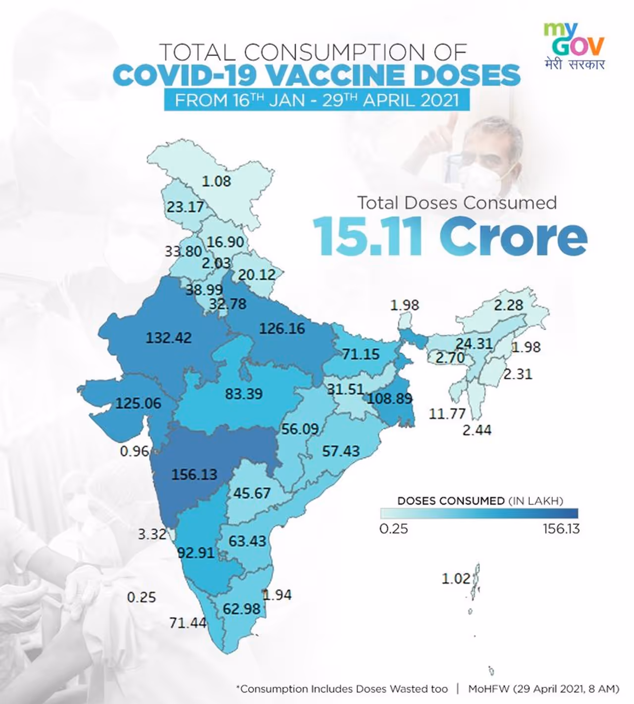 22,07,065 ಸೆಷನ್ಗಳ ಮೂಲಕ 15,00,20,648 ಲಸಿಕೆ ನೀಡಲಾಗಿದೆ. ಇವುಗಳಲ್ಲಿ 1 ನೇ ಡೋಸ್ ತೆಗೆದುಕೊಂಡ 93,67,520 ಎಚ್ಸಿಡಬ್ಲ್ಯೂ ಮತ್ತು 2 ನೇ ಡೋಸ್ ತೆಗೆದುಕೊಂಡ 61,47,918 ಎಚ್ಸಿಡಬ್ಲ್ಯೂಗಳು, 1,23,19,903 ಎಫ್ಎಲ್ಡಬ್ಲ್ಯೂ (1 ನೇ ಡೋಸ್), 66,12,789 ಎಫ್ಎಲ್ಡಬ್ಲ್ಯೂ (2 ನೇ ಡೋಸ್), 5,14,99,834 1 ನೇ ಡೋಸ್ ಫಲಾನುಭವಿಗಳು ಸೇರಿದ್ದಾರೆ.