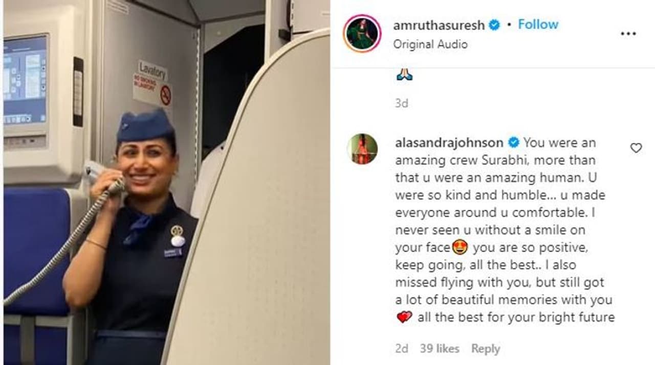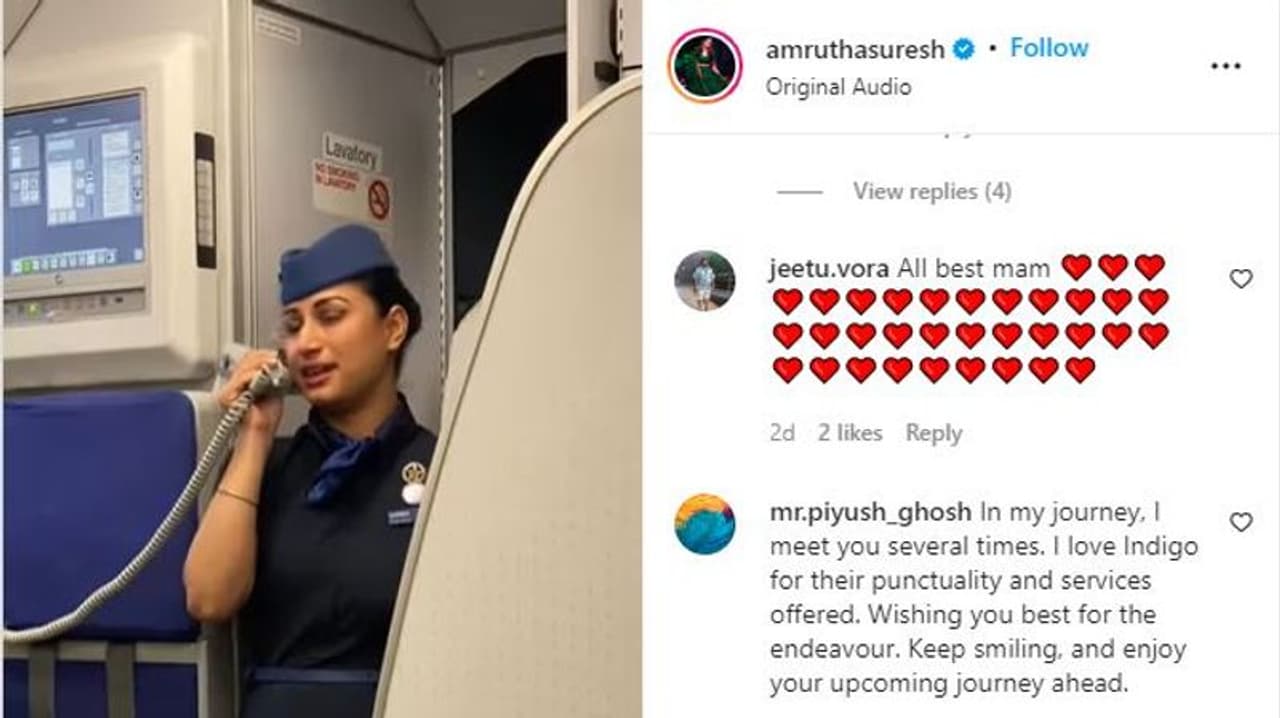 ಅಮೃತಾ ಸುರೇಶ್ ಇನ್ಸ್ಟಾಗ್ರಾಮ್ನಲ್ಲಿ ಹಂಚಿಕೊಂಡಿರುವ ಈ ವಿಡಿಯೋದಲ್ಲಿ ಫ್ಲೈಟ್ ಅಟೆಂಡೆಂಟ್ ಸುರಭಿ ನಾಯರ್ ಪ್ರಯಾಣಿಕರೊಂದಿಗೆ ಮಾತನಾಡುವುದನ್ನು ಕಾಣಬಹುದು. ವಿಡಿಯೋದಲ್ಲಿ ಸುರಭಿ ಕಣ್ಣೀರು ಸುರಿಸುತ್ತಾ ತಮ್ಮ ಸಂಸ್ಥೆಯ ಬಗ್ಗೆ ಮತ್ತು ತನ್ನ ಹಿರಿಯರಿಂದ ಕಲಿತ ವಿಷಯಗಳ ಬಗ್ಗೆ ಮಾತನಾಡಿದ್ದಾರೆ. ಈ ಮೂಲಕ ಇಂಡಿಗೋ ಸಂಸ್ಥೆಗೆ ವಿದಾಯ ಹೇಳಿದ್ದಾಳೆ
