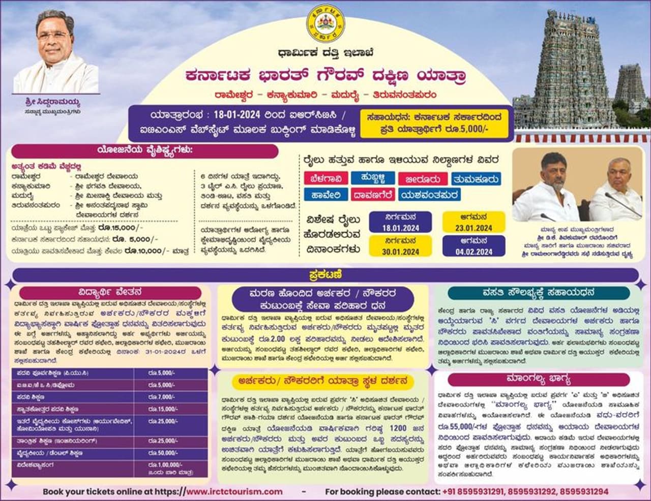 ರಾಜ್ಯ ಸರ್ಕಾರದ ಧಾರ್ಮಿಕ ದತ್ತಿ ಇಲಾಖೆಯ ಕರ್ನಾಟಕ ಭಾರತ್ ಗೌರವ್ ದಕ್ಷಿಣ ಯಾತ್ರಾ ಯೋಜನೆಯಡಿ ರಾಮೇಶ್ವರ- ಕನ್ಯಾಕುಮಾರಿ-ಮಧುರೈ-ತಿರುವನಂತಪುರಂ ಯಾತ್ರೆಯನ್ನು ಹಮ್ಮಿಕೊಂಡಿದೆ. ಇನ್ನು ಈ ಯಾತ್ರೆಯು ಅಯೋಧ್ಯೆ ರಾಮಮಂದಿರ ಉದ್ಘಾಟನಾ ಅವಧಿಯಲ್ಲಿಯೇ ಆಯೋಜನೆ ಮಾಡಲಾಗಿದೆ. ಜ.18ರಂದು ಕರ್ನಾಟಕದ ಬೆಳಗಾವಿ, ಹುಬ್ಬಳ್ಳಿ, ಹಾವೇರಿ, ದಾವಣಗೆರೆ, ಬೀರೂರು, ತುಮಕೂರು, ಯಶವಂತಪುರದಿಂದ ಯಾತ್ರೆ ಆರಂಭಿಸಿ ಮೊದಲ ತಾಣವಾಗಿ ರಾಮೇಶ್ವರವನ್ನು ತಲುಪಲಿದೆ. ನಂತರ ಉಳಿದ ಸ್ಥಳಗಳಿಗೆ ತೆರಳಲಿದೆ. ವಿಶೇಷ ರೈಲಿನಲ್ಲಿ ಹೊರಡುವ ಯಾತ್ರೆಯು ಜ.18ರಿಂದ ಆರಂಭವಾಗಿ ಜ.23ಕ್ಕೆ ಮುಕ್ತಾಯವಾಗಲಿದೆ. ಅಂದರೆ, ಸರ್ಕಾರ ಹಿಂದೂ ಯಾತ್ರಾರ್ಥಿಗಳನ್ನು ರಾಮಮಂದಿರದ ಬದಲು ರಾಮೇಶ್ವರದ ಕಡೆಗೆ ಕರೆದೊಯ್ಯುವ ಯೋಜನೆ ರೂಪಿಸಿದೆ.