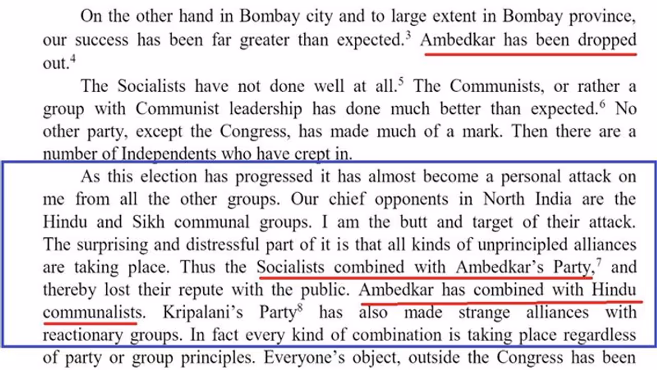 ಪಂಡಿತ್ ನೆಹರೂ ಬರೆದದ್ದು ಹೀಗೆ: ನಾವು ಬಾಂಬೆ ಸಿಟಿ ಹಾಗೂ ಬಾಂಬೆ ಪ್ರಾಂತ್ಯದಲ್ಲಿ ಊಹೆಗಿಂತಲೂ ಮೀರಿ ಯಶಸ್ಸು ಗಳಿಸಿದ್ದೇವೆ. ಅಂಬೇಡ್ಕರ್ ಈ ಚುನಾವಣೆಯಲ್ಲಿ ಹೊರಗುಳಿದಿದ್ದಾರೆ. ಸೋಶಿಯಲಿಸ್ಟ್ಗಳೂ ಬಹಳ ನಿರಾಶಾದಾಯಕ ಪ್ರದರ್ಶನ ತೋರಿದ್ದಾರೆ. ಆದರೆ ಕಮ್ಯೂನಿಸ್ಟ್ ಹಾಗೂ ಕಮ್ಯೂನಿಸ್ಟ್ ನೇತೃತ್ವದ ಒಂದು ತಂಡ ಬಹಳ ಉತ್ತಮ ಸಾಧನೆ ತೋರಿದೆ. ಇದನ್ನು ನಾವು ನಿರೀಕ್ಷಿಸಿರಲಿಲ್ಲ. ಇಡೀ ದೇಶದಲ್ಲಿ ನಾವು ಅತ್ಯುತ್ತಮ ಸಾಧನೆ ಮಾಡಿದ್ದೇವೆ. ಕೆಲ ಪಕ್ಷೇತರರೂ ಗೆದ್ದಿದ್ದಾರೆ ಎಂದಿದ್ದಾರೆ.