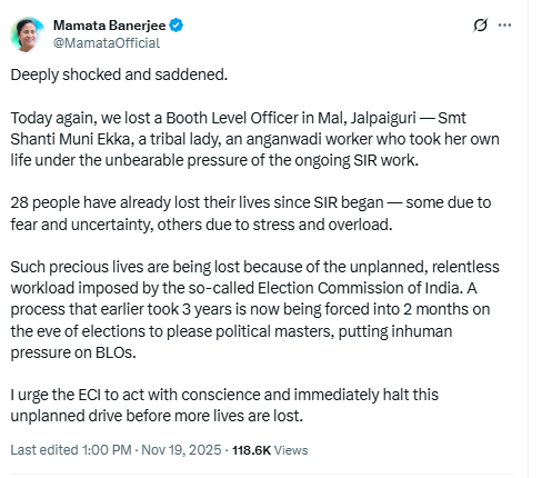 "ನನಗೆ ತೀವ್ರ ಆಘಾತ ಮತ್ತು ದುಃಖವಾಗಿದೆ. ಇಂದು ಮತ್ತೊಮ್ಮೆ, ಜಲಪೈಗುರಿಯ ಮಾಲ್ನಲ್ಲಿ ನಾವು ಒಬ್ಬ ಬೂತ್ ಮಟ್ಟದ ಅಧಿಕಾರಿಯನ್ನು ಕಳೆದುಕೊಂಡಿದ್ದೇವೆ - ನಡೆಯುತ್ತಿರುವ SIR ಕೆಲಸದ ಅಸಹನೀಯ ಒತ್ತಡದಲ್ಲಿ ತನ್ನ ಪ್ರಾಣವನ್ನೇ ಅಂಗನವಾಡಿ ಕಾರ್ಯಕರ್ತೆ ತೆಗೆದುಕೊಂಡಿದ್ದಾರೆ" ಎಂದು ಅವರು X ನಲ್ಲಿ ಬರೆದಿದ್ದಾರೆ.ಎಸ್ಐಆರ್ ಪ್ರಾರಂಭವಾದಾಗಿನಿಂದ ಈಗಾಗಲೇ 28 ಜನರು ಪ್ರಾಣ ಕಳೆದುಕೊಂಡಿದ್ದಾರೆ, ಕೆಲವರು ಭಯ ಮತ್ತು ಅನಿಶ್ಚಿತತೆಯಿಂದ, ಇತರರು ಒತ್ತಡ ಮತ್ತು ಅತಿಯಾದ ಹೊರೆಯಿಂದ ಪ್ರಾಣ ಕಳೆದುಕೊಂಡಿದ್ದಾರೆ ಎಂದು ಅವರು ಹೇಳಿದರು.