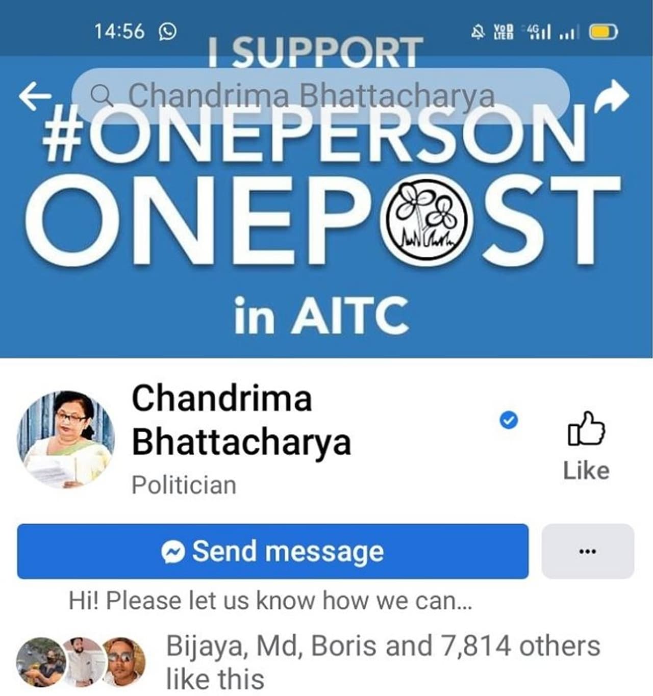 ಮಮತಾ ಬ್ಯಾನರ್ಜಿಯವರ ಪಕ್ಷವಾದ ತೃಣಮೂಲ ಕಾಂಗ್ರೆಸ್ (ಟಿಎಂಸಿ) ನಲ್ಲಿ 'ಒಬ್ಬ ವ್ಯಕ್ತಿಗೆ ಒಂದೇ ಹುದ್ದೆ' ಅಭಿಯಾನದ ಕುರಿತು ಹೊಸ ವಿವಾದ ಭುಗಿಲೆದ್ದಿದೆ. ಶುಕ್ರವಾರ, ಮಮತಾ ಬ್ಯಾನರ್ಜಿ ಸರ್ಕಾರದ ಸಚಿವೆ ಮತ್ತು ಟಿಎಂಸಿ ನಾಯಕಿ ಚಂದ್ರಿಮಾ ಭಟ್ಟಾಚಾರ್ಯ ಅವರು ತಮ್ಮ ಸಾಮಾಜಿಕ ಮಾಧ್ಯಮ ಖಾತೆಯಿಂದ ಈ ಘೋಷಣೆಯನ್ನು ಪೋಸ್ಟ್ ಮಾಡಿದ್ದಾರೆ. ವಿವಾದ ಉಲ್ಬಣಗೊಳ್ಳುತ್ತಿದ್ದಂತೆ, ಸಾಮಾಜಿಕ ಮಾಧ್ಯಮದಲ್ಲಿ ಪೋಸ್ಟ್ ಅನ್ನು ಪ್ರಶಾಂತ್ ಕಿಶೋರ್ ಅವರ ಸಲಹಾ ಗುಂಪು ಐ-ಪಿಎಸಿ ಮಾಡಿದ್ದು ಎಂದು ಅವರು ಹೇಳಿದ್ದಾರೆ. "ಈ ಪೋಸ್ಟ್ ಅವರನ್ನು ಕೇಳದೆ ಮಾಡಲಾಗಿದೆ, ಇದನ್ನು ಐಪಿಎಸಿ ಮಾಡಿದೆ, ಇದು ಅಪರಾಧ ಎಂದು ನಾನು ಭಾವಿಸುತ್ತೇನೆ" ಎಂದಿದ್ದಾರೆ. ಬಳಿಕ ಚಂದ್ರಿಮಾ ಭಟ್ಟಾಚಾರ್ಯ ಅವರ ಸಾಮಾಜಿಕ ಮಾಧ್ಯಮ ಖಾತೆಯನ್ನು ಟಿಎಂಸಿ ಮುಖ್ಯಸ್ಥೆ ಮಮತಾ ಬ್ಯಾನರ್ಜಿಯವರ ಚಿತ್ರದೊಂದಿಗೆ ಬದಲಾಯಿಸಲಾಯಿತು.