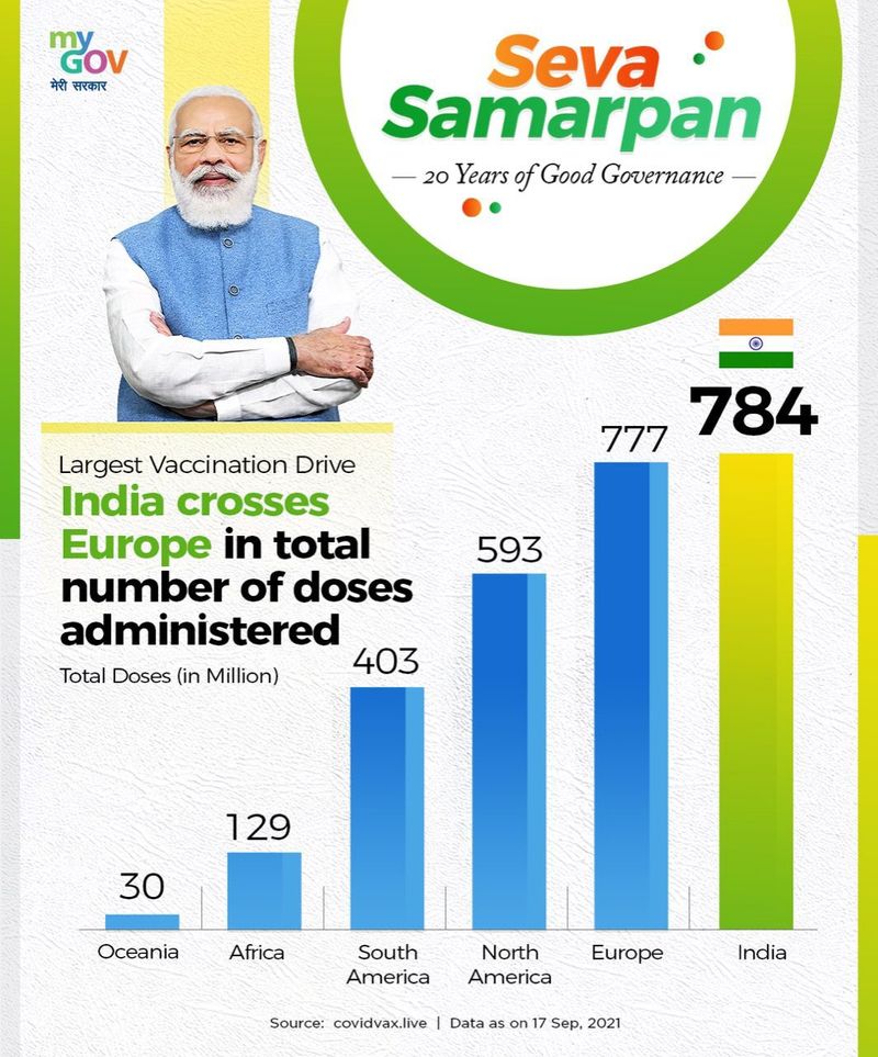 ಭಾರತ ಇದುವರೆಗೆ 784 ಮಿಲಿಯನ್ ಡೋಸ್ ಹಾಕಿದೆ. ಈ ಮೂಲಕ 777 ಡೋಸ್ ಹಾಕಿ ಮೊದಲ ಸ್ಥಾನದಲ್ಲಿದ್ದ ಯುರೋಪ್ ಹಿಂದಿಕ್ಕಿ ಅಗ್ರಸ್ಥಾನಕ್ಕೇರಿದೆ. ಭಾರತದ ಈ ಸಾಧನೆಗೆ ಹಲವು ರಾಷ್ಟ್ರಗಳು ಮೆಚ್ಚುಗೆ ವ್ಯಕ್ತಪಡಿಸಿದೆ.
