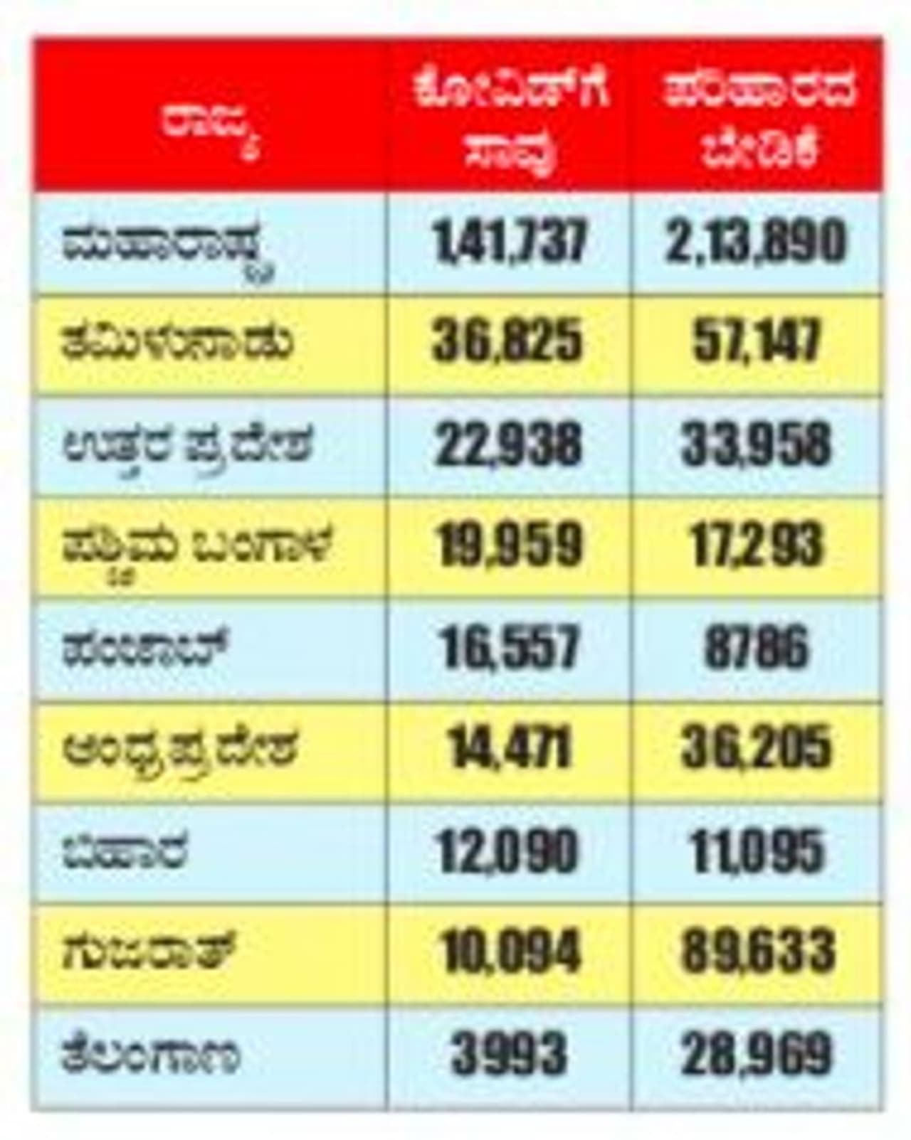 * ತೆಲಂಗಾಣ, ಗುಜರಾತ್ನಲ್ಲಿ ಅರ್ಜಿಗಳ ಸಲ್ಲಿಕೆ* ಕೋವಿಡ್: ಮೃತರ ಸಂಖ್ಯೆಗಿಂತ ಪರಿಹಾರಕ್ಕೆ 9 ಪಟ್ಟು ಹೆಚ್ಚು ಬೇಡಿಕೆ!* ಸುಪ್ರೀಂಗೆ ಸಲ್ಲಿಸಲಾದ ರಾಜ್ಯಗಳ ಮಾಹಿತಿಯಲ್ಲಿ ಈ ಅಂಶ