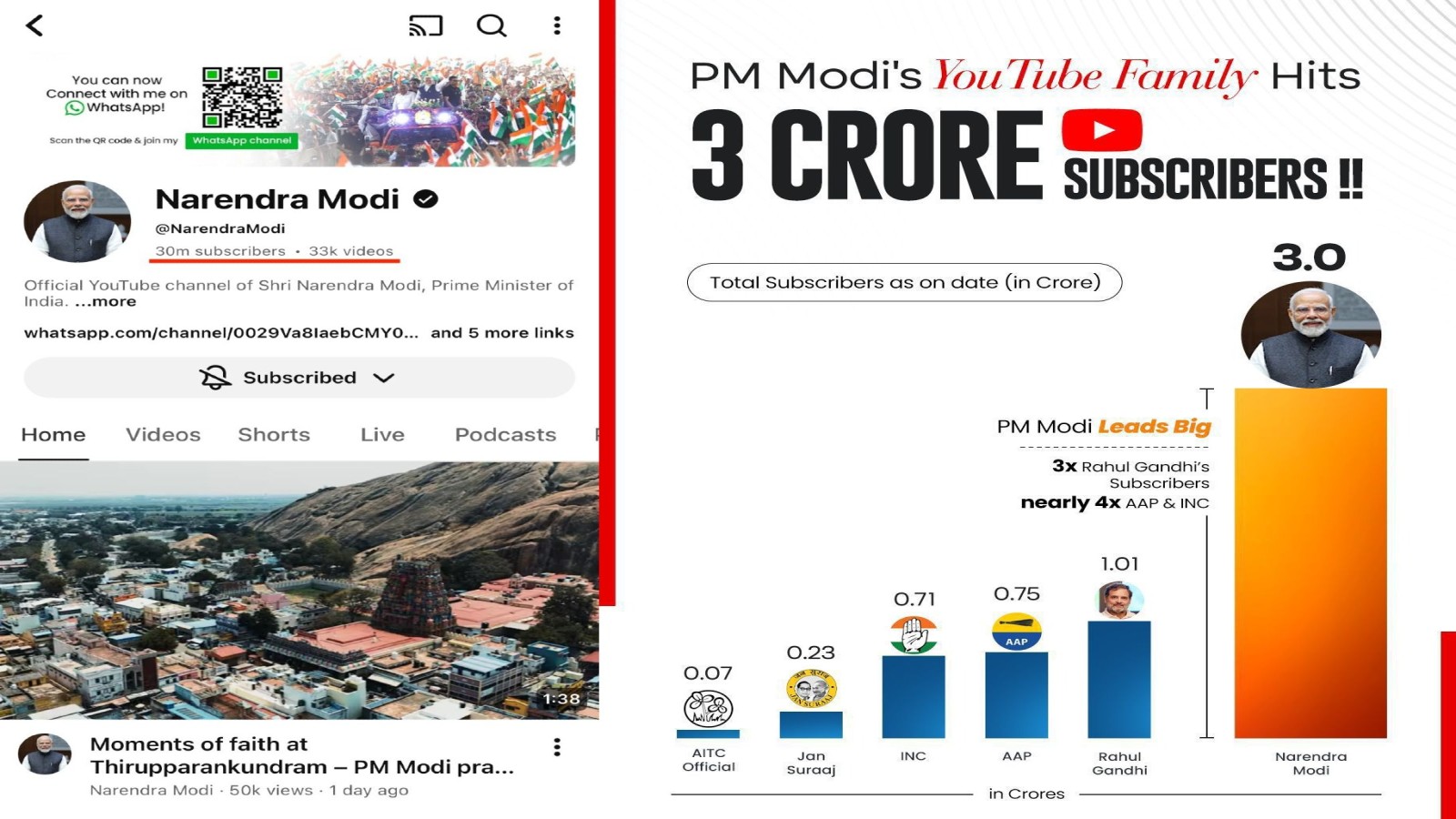 ಪ್ರಧಾನಿ ನರೇಂದ್ರ ಮೋದಿ ಯೂಟ್ಯೂಬ್ನಲ್ಲಿ 3 ಕೋಟಿ ಚಂದಾದಾರರನ್ನು ಹೊಂದುವ ಮೂಲಕ ಜಗತ್ತಿನ ಮೊದಲ ಜನನಾಯಕರಾಗಿದ್ದಾರೆ. ಈ ಬೃಹತ್ ಹಿಂಬಾಲಕರ ಬಳಗದಿಂದ ಅವರಿಗೆ ಎಷ್ಟು ಆದಾಯ ಬರಬಹುದು ಮತ್ತು ಅವರ ಚಾನೆಲ್ ಮಾನಿಟೈಸ್ ಆಗಿದೆಯೇ ಎಂಬ ಕುತೂಹಲಕಾರಿ ಮಾಹಿತಿಯನ್ನು ಈ ಲೇಖನವು ಬಹಿರಂಗಪಡಿಸುತ್ತದೆ.