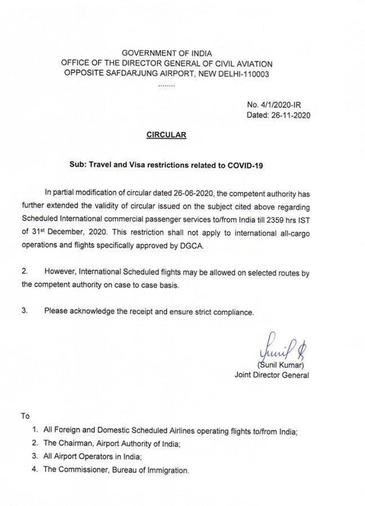 ನವೆಂಬರ್ ತಿಂಗಳ ಆರಂಭದಲ್ಲಿ ಕೇಂದ್ರ ವಿಮಾನಯಾನ ಇಲಾಖೆ ಅಂತಾರಾಷ್ಟ್ರೀಯ ಪ್ರಯಾಣಿಕರ ಹಾರಾಟ ನಿಷೇಧವನ್ನು ನವೆಂಬರ್ 30ರ ವರೆಗೆ ವಿಸ್ತರಿಸಿತ್ತು. ಇದೀಗ ಡಿಸೆಂಬರ್ 31ರ ವರೆಗೆ ವಿಸ್ತರಿಸಿದೆ.