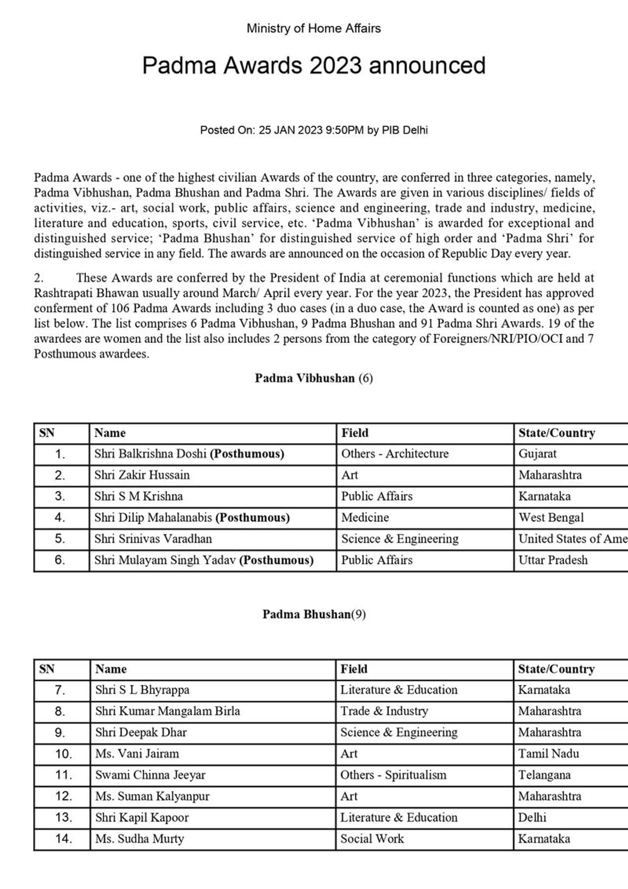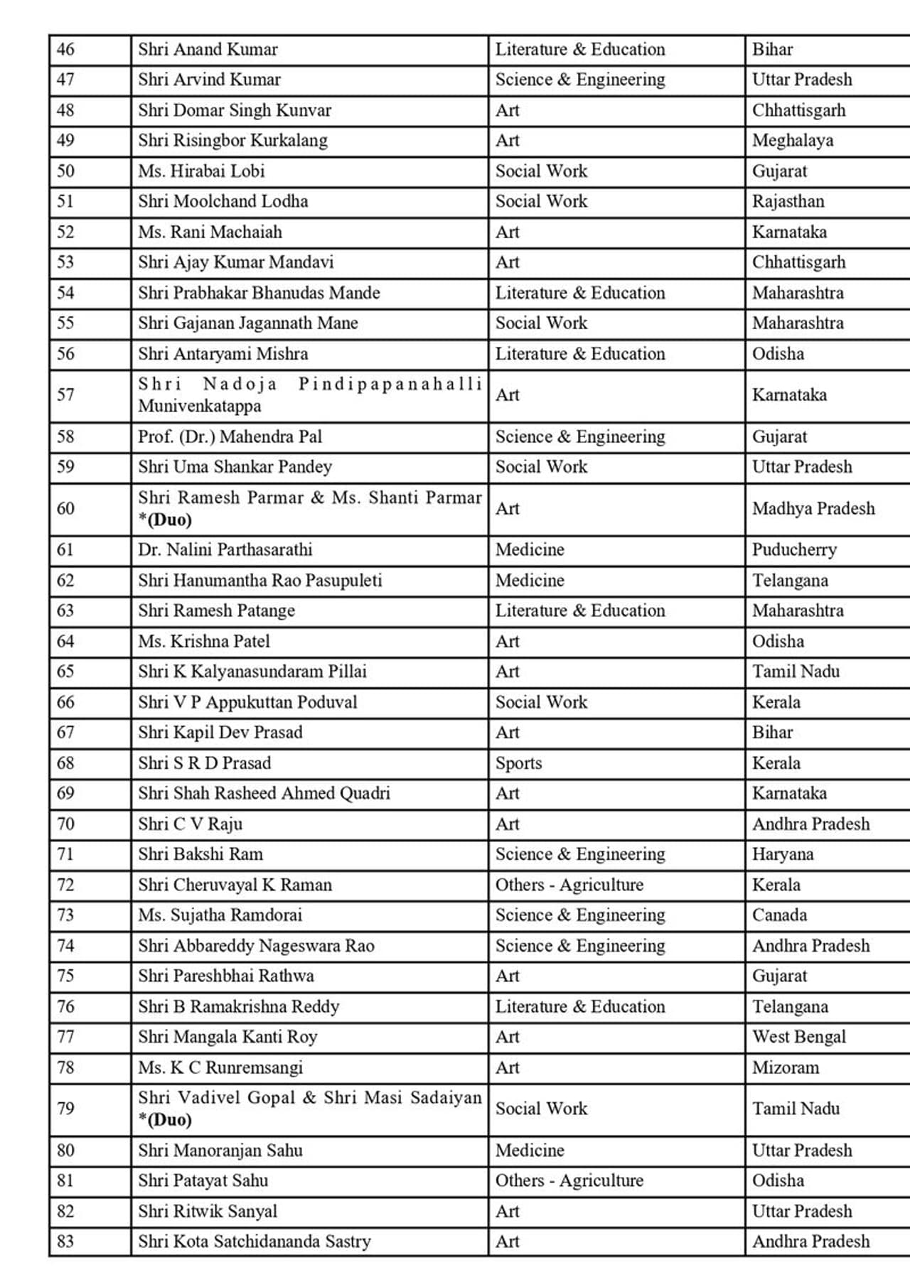 ಈ ಪಟ್ಟಿಯು 6 ಪದ್ಮವಿಭೂಷಣ, 9 ಪದ್ಮಭೂಷಣ ಮತ್ತು 91 ಪದ್ಮಶ್ರೀ ಪ್ರಶಸ್ತಿಗಳನ್ನು ಒಳಗೊಂಡಿದೆ. ಪ್ರಶಸ್ತಿ ಪುರಸ್ಕೃತರಲ್ಲಿ 19 ಮಹಿಳೆಯರು ಮತ್ತು ಪಟ್ಟಿಯು ವಿದೇಶಿಯರು ವರ್ಗದಿಂದ 2 ವ್ಯಕ್ತಿಗಳು ಮತ್ತು 7 ಮರಣೋತ್ತರ ಪ್ರಶಸ್ತಿ ಪುರಸ್ಕೃತರನ್ನು ಒಳಗೊಂಡಿದೆ.
