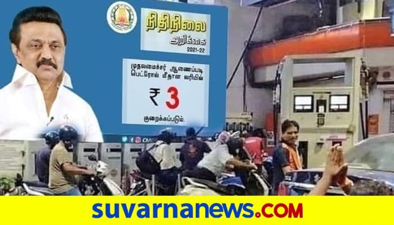 ಚೆನ್ನೈ(ಆ.14): ಪೆಟ್ರೋಲ್ ಬೆಲೆ 100 ರು. ದಾಟಿದ ಈ ಹೊತ್ತಿನಲ್ಲಿ ಜನಸಾಮಾನ್ಯರಿಗೆ ಅನುಕೂಲ ಒದಗಿಸಲು ತಮಿಳುನಾಡು ಸರ್ಕಾರ, ಬೆಲೆಯನ್ನು ಕಡಿಮೆ ಮಾಡಲು ನಿರ್ಧರಿಸಿದೆ. ಇದು ಆಗಸ್ಟ್ 14ರ ಮಧ್ಯರಾತ್ರಿಯಿಂದ ಜಾರಿಗೆ ಬರುವಂತೆ ಲೀಟರ್ಗೆ 3 ರು. ಕಡಿತ ಮಾಡುವುದಾಗಿ ಸರ್ಕಾರ ಪ್ರಕಟಿಸಿದೆ.