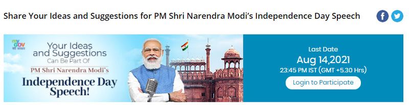 * ಭಾರತಕ್ಕೆ 75 ನೇ ಸ್ವಾತಂತ್ರ್ಯೋವ ಸಂಭ್ರಮ* ಐತಿಹಾಸಿಕ ಕೆಂಪುಕೋಟೆಯಿಂದ ಮೋದಿ ಭಾಷಣ, ಈ ಬಾರಿ ವಿಶೇಷ* ಸ್ವಾತಂತ್ರ್ಯೋತ್ಸವದ ಮೋದಿ ಭಾಷಣಕ್ಕೆ ನಿಮ್ಮ ಯೋಚನೆ, ಸಲಹೆಗಳಿಗೆ ಅವಕಾಶ