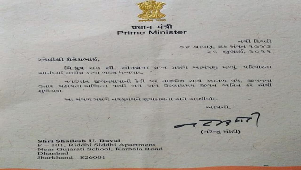 * ಗುಜರಾತ್ ನವದಂಪತಿಗೆ ಮದುವೆ ದಿನ ಅಚ್ಚರಿ* ಗುಜರಾತ್ನ ನವ ದಂಪತಿಗೆ ಪಿಎಂ ಮೋದಿ ಸಪ್ರೈಜ್ * ಪತ್ರ ಕಳುಹಿಸಿ ಶುಭ ಕೋರಿದ ಮೋದಿ