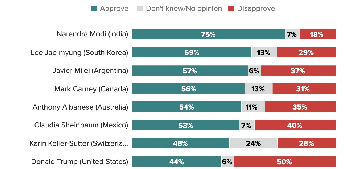 ದಕ್ಷಿಣ ಕೊರಿಯಾದ ಹೊಸದಾಗಿ ಆಯ್ಕೆಯಾದ ಅಧ್ಯಕ್ಷ ಲೀ ಜೇ ಮ್ಯುಂಗ್ ಅವರನ್ನು ಹಿಂದಿಕ್ಕಿ ಮೋದಿ ಜಾಗತಿಕ ಪಟ್ಟಿಯಲ್ಲಿ ಅಗ್ರಸ್ಥಾನದಲ್ಲಿದ್ದಾರೆ, ಅವರು ಶೇ. 59 ರಷ್ಟು ಅನುಮೋದನೆಯೊಂದಿಗೆ ಎರಡನೇ ಸ್ಥಾನ ಪಡೆದರು. 2025ರ ಜುಲೈ 4 ಮತ್ತು 10ರ ನಡುವೆ ನಡೆಸಲಾದ ಈ ಸಮೀಕ್ಷೆಯು, ಬಹು ದೇಶಗಳಲ್ಲಿ ಏಳು ದಿನಗಳ ಸರಾಸರಿಗಳನ್ನು ಬಳಸಿಕೊಂಡು ಪ್ರಜಾಪ್ರಭುತ್ವ ವಿಶ್ವ ನಾಯಕರ ಸಾರ್ವಜನಿಕ ಅಭಿಪ್ರಾಯವನ್ನು ಟ್ರ್ಯಾಕ್ ಮಾಡುತ್ತದೆ.