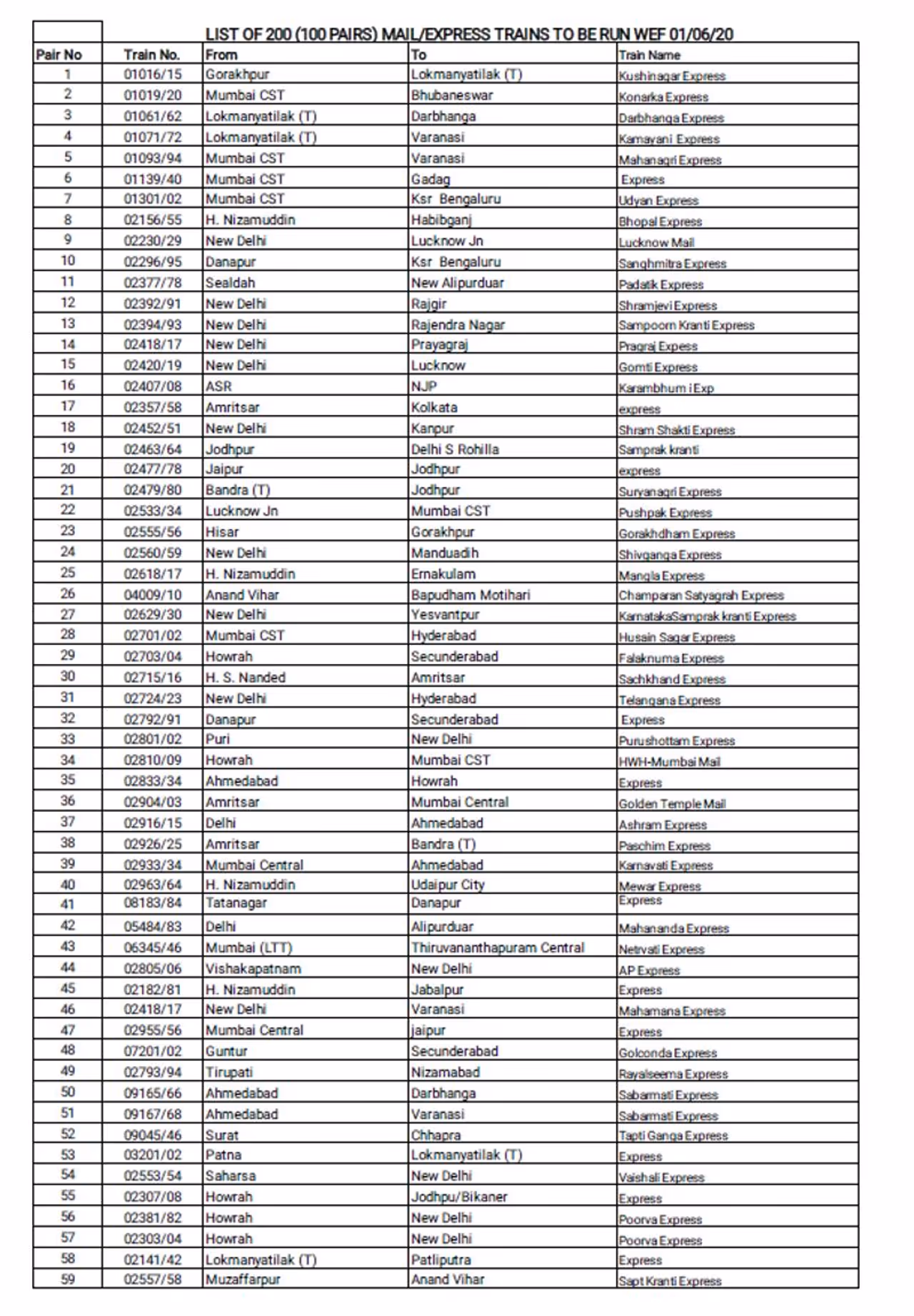 ದೇಶವ್ಯಾಪಿ ಜೂನ್ 1 ರಿಂದ ಆರಂಭವಾಗುತ್ತೆ ರೈಲು| ಆನ್ಲೈನ್ ಟಿಕೆಟ್ ಬುಕ್ಕಿಂಗ್ ಆರಮಭ| ರೈಲುಗಳ ಪಟ್ಟಿ ಬಿಡುಗಡೆ ಮಾಡಿದ ರೈಲ್ವೇ ಇಲಾಖೆ