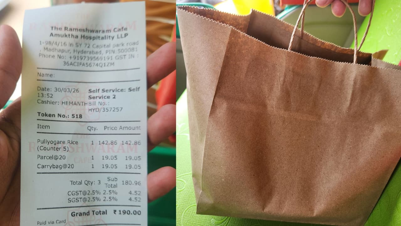 ಹೈದರಾಬಾದ್ನ ರಾಮೇಶ್ವರಂ ಕೆಫೆಯು ತನ್ನ ಪಾರ್ಸಲ್ ಮತ್ತು ಪೇಪರ್ ಬ್ಯಾಗ್ ಶುಲ್ಕಕ್ಕಾಗಿ ತೀವ್ರ ಟೀಕೆಗೆ ಗುರಿಯಾಗಿದೆ. ₹150ರ ಪುಳಿಯೋಗರೆಗೆ ₹40 ಪ್ಯಾಕಿಂಗ್ ಶುಲ್ಕ ವಿಧಿಸಿದ್ದು, ಈ 'ಹಿಡನ್ ಚಾರ್ಜ್' ಬಗ್ಗೆ ಸಾಮಾಜಿಕ ಜಾಲತಾಣದಲ್ಲಿ ದೊಡ್ಡ ಚರ್ಚೆಯನ್ನೇ ಹುಟ್ಟುಹಾಕಿದೆ.