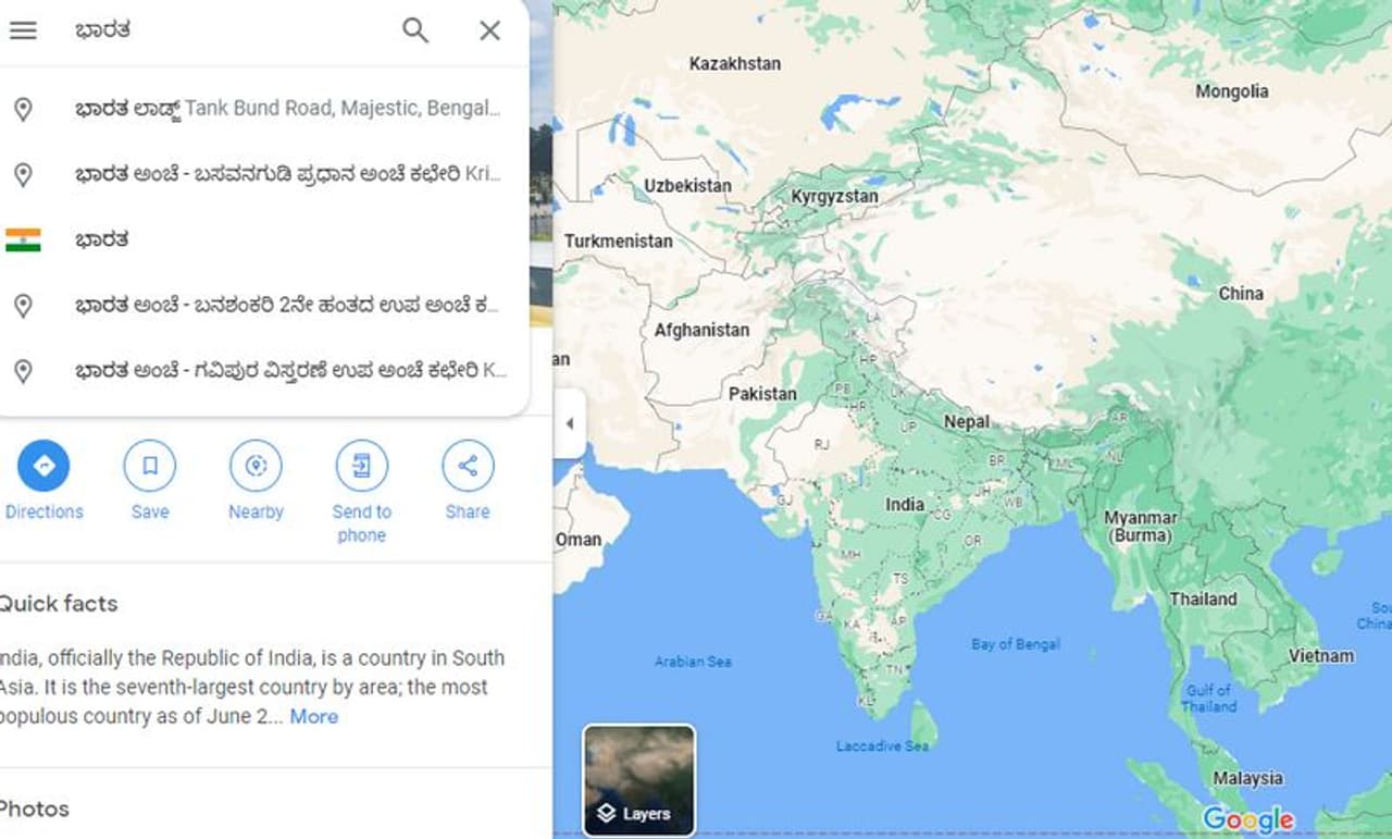 ಇಷ್ಟು ದಿನ ಇಂಡಿಯಾ ಎಂದು ಸರ್ಚ್ ಮಾಡಿದರೆ ಮಾತ್ರ ಭಾರತದ ಮ್ಯಾಪನ್ನು ತೋರಿಸುತ್ತಿತ್ತು. ಆದರೆ ಇದೀಗ ಕನ್ನಡದಲ್ಲಿ ಭಾರತ ಅಥವಾ ಹಿಂದಿ, ಇಂಗ್ಲೀಷ್ ಸೇರಿದಂತೆ ಇತರ ಭಾಷೆಗಳಲ್ಲಿ ಸರ್ಚ್ ಮಾಡಿದರೆ ಭಾರತದ ಮ್ಯಾಪನ್ನು ಗೂಗಲ್ ತೋರಿಸುತ್ತದೆ. ವಿಶೇಷ ಅಂದರೆ ಭಾರತ ಹೆಸರಿನ ಜೊತೆಗೆ ತ್ರಿವರ್ಣ ಧ್ವಜವೂ ಪ್ರದರ್ಶಿಸುತ್ತದೆ.