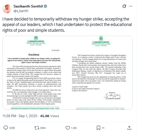 ತಮಿಳುನಾಡಿಗೆ ಸಮಗ್ರ ಶಿಕ್ಷಾ ಅಭಿಯಾನ (ಎಸ್ಎಸ್ಎ) ನಿಧಿಯನ್ನು ಬಿಡುಗಡೆ ಮಾಡುವಂತೆ ಒತ್ತಾಯಿಸಿ ಅನಿರ್ದಿಷ್ಟಾವಧಿ ಉಪವಾಸ ಸತ್ಯಾಗ್ರಹ ಆರಂಭಿಸಿದ್ದ ತಿರುವಲ್ಲೂರು ಸಂಸದ ಶಶಿಕಾಂತ್ ಸೆಂಥಿಲ್, ಸೆಪ್ಟೆಂಬರ್ 1 ರ ಸೋಮವಾರ ರಾತ್ರಿ ತಮ್ಮ ಪ್ರತಿಭಟನೆಯನ್ನು ತಾತ್ಕಾಲಿಕವಾಗಿ ಕೊನೆಗೊಳಿಸುತ್ತಿರುವುದಾಗಿ ಘೋಷಿಸಿದರು.