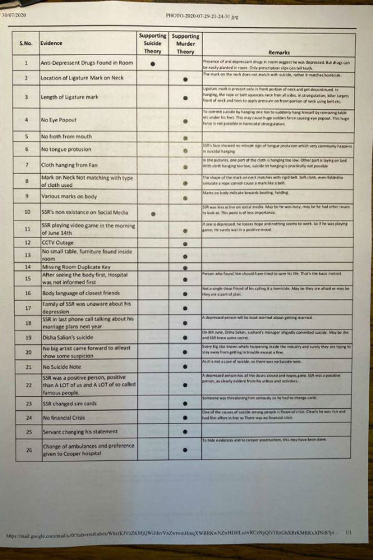 ಆದರೆ ಹತ್ಯೆ ಸಿದ್ಧಾಂತದಲ್ಲಿ ಕುತ್ತಿಗೆಯ ಮೇಲೆ ಗುರುತು ಇರುವ ಸ್ಥಳ, ಬಾಯಿಯಿಂದ ನೊರೆ ಬಂದಿಲ್ಲ, ಆತ್ಮಹತ್ಯೆ ಸಂದರ್ಭದಲ್ಲಿ ಆಗುವಂತೆ ಕಣ್ಣು ಹೊರಗೆ ಬಂದಿಲ್ಲ ಇಷ್ಟೂ ಅಲ್ಲದೆ ಸುಶಾಂತ್ ಹಿಂದಿನ ದಿನ ಬೆಳಗ್ಗೆ ವಿಡಿಯೋ ಗೇಮ್ ಆಡಿಕೊಂಡಿದ್ದ ಎಂದು ಬರೆದಿದ್ದಾರೆ.