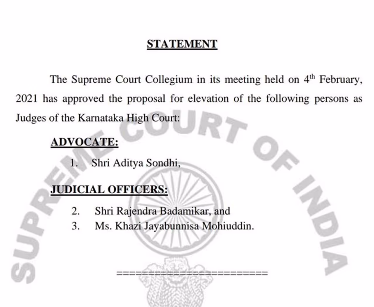 ಹೈಕೋರ್ಟ್ ಹಾಲಿ ರಿಜಿಸ್ಟಾರ್ ಜನರಲ್ ರಾಜೇಂದ್ರ ಬಾದಾಮಿಕರ್, ಜಿಲ್ಲಾ ನ್ಯಾಯಾಧೀಶೆ ಖಾಜಿ ಜಯಬುನ್ನಿಸಾ ಮೊಹಿದ್ದೀನ್ ಹಾಗೂ ವಕೀಲ ವೃಂದದಿಂದ ಹಿರಿಯ ವಕೀಲ ಆದಿತ್ಯ ಸೋಂಧಿ ಹೆಸರುಗಳನ್ನು ಸುಪ್ರೀಂ ಕೋರ್ಟ್ ಕೊಲಿಜಿಯಂ ಕೇಂದ್ರ ಸರ್ಕಾರಕ್ಕೆ ಶಿಫಾರಸು ಮಾಡಿದೆ