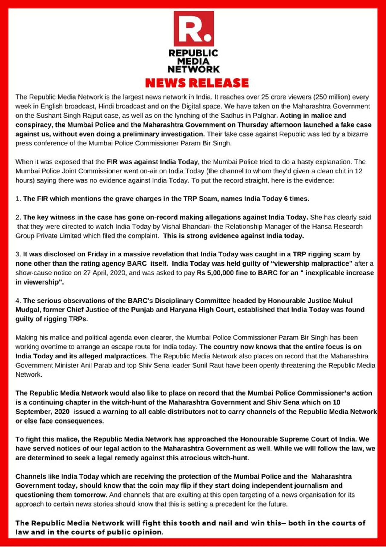 ಶುಕ್ರವಾರ ಸುದ್ದಿಗೋಷ್ಠಿ ನಡೆಸಿದ್ದ ಮುಂಬೈ ಪೊಲೀಸ್ ಆಯುಕ್ತ ಪರಮ್ ಬೀರ್ ಸಿಂಗ್ ಸುಶಾಂತ್ ಸಿಂಗ್ ರಜಪೂತ್ ಸಾವಿನ ಪ್ರಕರಣದಲ್ಲಿ ಮುಂಬೈ ಪೊಲೀಸರು ಮತ್ತು ಮಹಾರಾಷ್ಟ್ರ ಸರ್ಕಾರದ ಮೇಲೆ ನಡೆಸಿದ ದಾಳಿಯ ಬಗ್ಗೆ ರಿಪಬ್ಲಿಕ್ ಟಿವಿ ಚಾನಲ್ ಟಿಆರ್ಪಿ ದಂಧೆಯಲ್ಲಿ ಭಾಗಿಯಾಗಿದೆ ಎಂದು ಆರೋಪಿಸಿತ್ತು. ಅಲ್ಲದೇ ಟಿಆರ್ಪಿ ದಂಧೆಯನ್ನು ಪತ್ತೆ ಹಚ್ಚಿದ ಮುಂಬೈ ಪೊಲೀಸರ ಕ್ರೈಂ ಬ್ರ್ಯಾಂಚ್ ಎರಡು ಮರಾಠಿ ಚಾನೆಲ್ಗಳ ಮಾಲೀಕರನ್ನು ಬಂಧಿಸಿರುವುದಾಗಿಯೂ ತಿಳಿಸಿದ್ದರು.