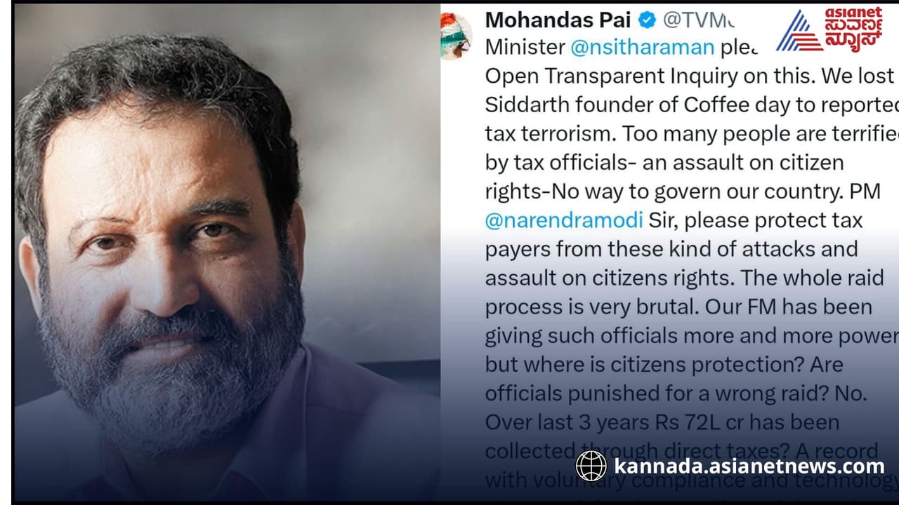 ಉದ್ಯಮಿ ಸಿಜೆ ರಾಯ್ ಅವರ ದುರಂತ ಅಂತ್ಯದ ನಂತರ, ಖ್ಯಾತ ಉದ್ಯಮಿ ಟಿ.ವಿ. ಮೋಹನ್ದಾಸ್ ಪೈ ಅವರು ತೆರಿಗೆ ಅಧಿಕಾರಿಗಳ ಕಿರುಕುಳ ಮತ್ತು ವ್ಯವಸ್ಥೆಯಲ್ಲಿನ ಲೋಪದೋಷಗಳ ವಿರುದ್ಧ ಧ್ವನಿ ಎತ್ತಿದ್ದಾರೆ. ದಾಖಲೆಯ ತೆರಿಗೆ ಸಂಗ್ರಹದ ನಡುವೆಯೂ ಈ ರೀತಿಯ ಕ್ರೂರ ದಾಳಿಗಳ ಅಗತ್ಯವೇನಿದೆ ಎಂದು ಪ್ರಶ್ನಿಸಿದ್ದಾರೆ.