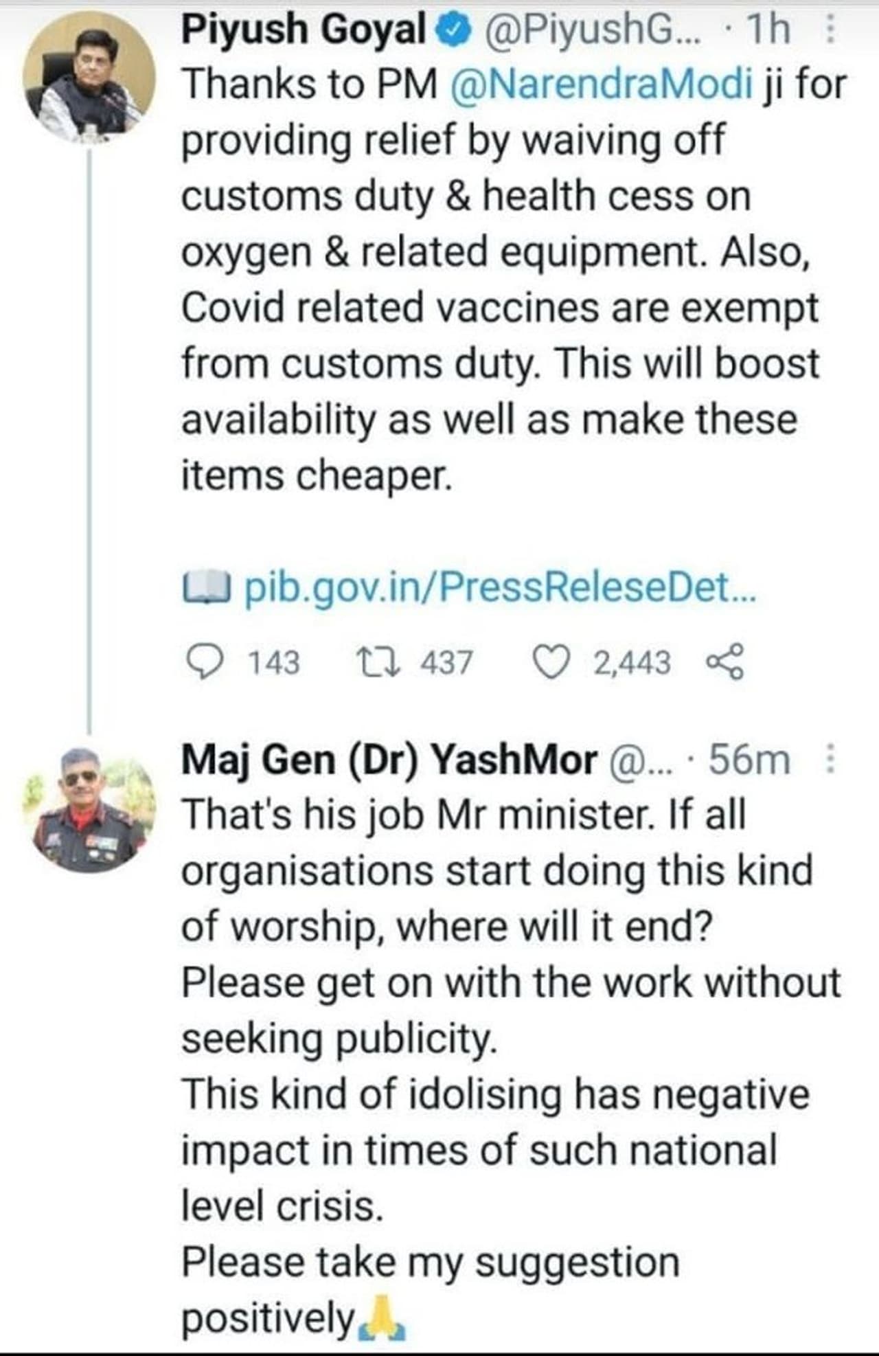 ಆದರೆ ಇದಕ್ಕೆ ಒಳ್ಳೆಯ ರೀತಿಯಲ್ಲಿ ಪ್ರತಿಕ್ರಿಯೆ ನೀಡಿದ ಮೇಜರ್ ಜನರಲ್ ಡಾ. ಯಶ್ ಮೋರ್, ಇದು ಅವರ ಕರ್ತವ್ಯ ಮಿಸ್ಟರ್ ಮಿನಿಸ್ಟರ್, ಎಲ್ಲ ಸಂಸ್ಥೆಗಳು ಈ ರೀತಿ ಹೊಗಳುವುದು, ಪೂಜೆ ಮಾಡುವುದನ್ನು ಆರಂಭಿಸಿದರೆ ಇದಕ್ಕೊಂದು ಅಂತ್ಯ ಇದೆಯೇ? ಪ್ರಚಾರವನ್ನು ಬದಿಗಿಟ್ಟು ಕೆಲಸದಲ್ಲಿ ತೊಡಗಿಕೊಳ್ಳಿ. ಈ ರೀತಿ ವ್ಯಕ್ತಿ ಹೊಗಳಿಕೆ ನೆಗೆಟಿವ್ ಪರಿಣಾಮ ಉಂಟುಮಾಡಬಲ್ಲದು. ದೇಶವೇ ವಿಪತ್ತು ಎದುರಿಸುತ್ತಿರುವಾಗ ಇದೆಲ್ಲ ಬೇಡ.. ದಯವಿಟ್ಟು ನನ್ನ ಸಲಹೆಯನ್ನು ಸಕಾರಾತ್ಮಕವಾಗಿ ತೆಗೆದುಕೊಳ್ಳಿ, ಎಂದು ಸಲಹೆ ಕೊಟ್ಟಿದ್ದಾರೆ.
