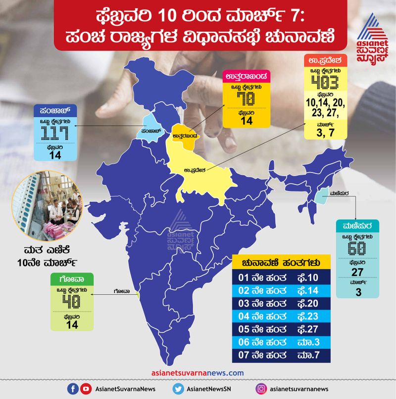 ಫೆ.10 ರಿಂದ ಮಾರ್ಚ್ 7ರ ವರೆಗೆ ಏಳು ಹಂತಗಳಲ್ಲಿ ಪಂಚ ರಾಜ್ಯ ಚುನಾವಣೆಉತ್ತರ ಪ್ರದೇಶದಲ್ಲಿ ಏಳೂ ಹಂತಗಳಲ್ಲಿ ನಡೆಯಲಿದೆ ಚುನಾವಣೆಗೋವಾ, ಪಂಜಾಬ್ ಹಾಗೂ ಮಣಿಪುರದಲ್ಲಿ ಒಂದೇ ಹಂತದಲ್ಲಿ ಮತದಾನಮಾರ್ಚ್ 10 ರಂದು ಪಂಚರಾಜ್ಯಗಳ ಚುನಾವಣೆಯ ಮತಎಣಿಕೆ