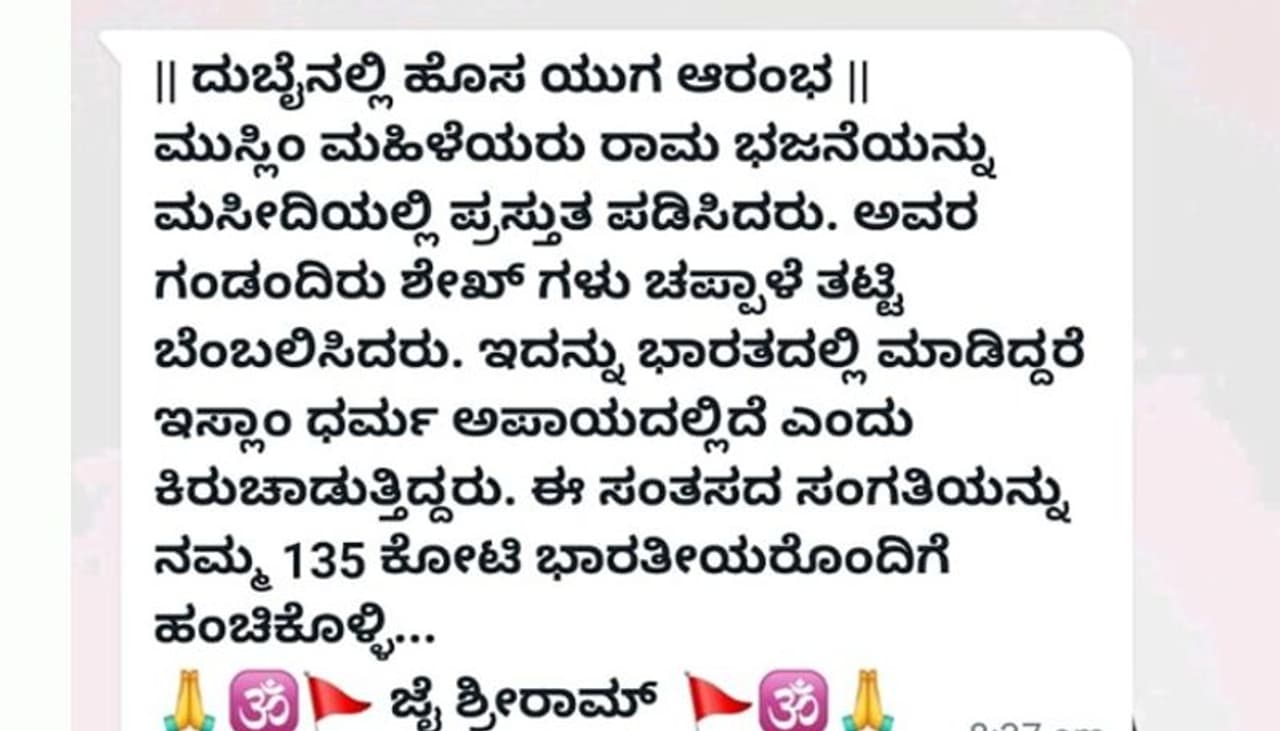 ಮೇಸೆಜಿಂಗ್ ಪ್ಲಾಟ್ಫಾರ್ಮ್ ವಾಟ್ಸಪ್ನಲ್ಲಿ (WhatsApp) ಹರಿದಾಡುತ್ತಿರುವ ಮೇಸೆಜ್ ಈ ರೀತಿ ಇದೆ: " || ದುಬೈನಲ್ಲಿ ಹೊಸ ಯುಗ ಆರಂಭ || ಮುಸ್ಲಿಂ ಮಹಿಳೆಯರು ರಾಮ ಭಜನೆಯನ್ನು ಮಸೀದಿಯಲ್ಲಿ ಪ್ರಸ್ತುತ ಪಡಿಸಿದರು. ಅವರ ಗಂಡಂದಿರು ಶೇಖ್ ಗಳು ಚಪ್ಪಾಳೆ ತಟ್ಟಿ ಬೆಂಬಲಿಸಿದರು. ಇದನ್ನು ಭಾರತದಲ್ಲಿ ಮಾಡಿದ್ದರೆ ಇಸ್ಲಾಂ ಧರ್ಮ ಅಪಾಯದಲ್ಲಿದೆ ಎಂದು ಕಿರುಚಾಡುತ್ತಿದ್ದರು. ಈ ಸಂತಸದ ಸಂಗತಿಯನ್ನು ನಮ್ಮ 135 ಕೋಟಿ ಭಾರತೀಯರೊಂದಿಗೆ ಹಂಚಿಕೊಳ್ಳಿ...". ಈ ಹಿಂದೆ ಈ ವೀಡಿಯೊವನ್ನು ಯುಟ್ಯೂಬ್ ಮತ್ತು ಇತರ ಹಲವಾರು ಸಾಮಾಜಿಕ ಮಾಧ್ಯಮ ವೇದಿಕೆಗಳಲ್ಲಿ ವ್ಯಾಪಕವಾಗಿ ಹಂಚಿಕೊಳ್ಳಲಾಗಿತ್ತು. ಈ ವಿಡಿಯೋ ಈಗ ವಾಟ್ಸಪ್ ನಲ್ಲಿ ಮತ್ತೆ ಸದ್ದು ಮಾಡುತ್ತಿದೆ.