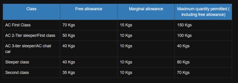 ಭಾರತೀಯ ರೈಲ್ವೆಯಲ್ಲಿ ಪ್ರಯಾಣಿಸುವಾಗ ಲಗೇಜ್ ಮಿತಿಗಳ ಬಗ್ಗೆ ತಿಳಿದುಕೊಳ್ಳುವುದು ಮುಖ್ಯ. ಪ್ರಯಾಣದ ವರ್ಗಕ್ಕೆ ಅನುಗುಣವಾಗಿ ಲಗೇಜ್ ಭತ್ಯೆ ಬದಲಾಗುತ್ತದೆ ಮತ್ತು ಹೆಚ್ಚುವರಿ ಲಗೇಜ್ಗೆ ಶುಲ್ಕ ವಿಧಿಸಲಾಗುತ್ತದೆ.