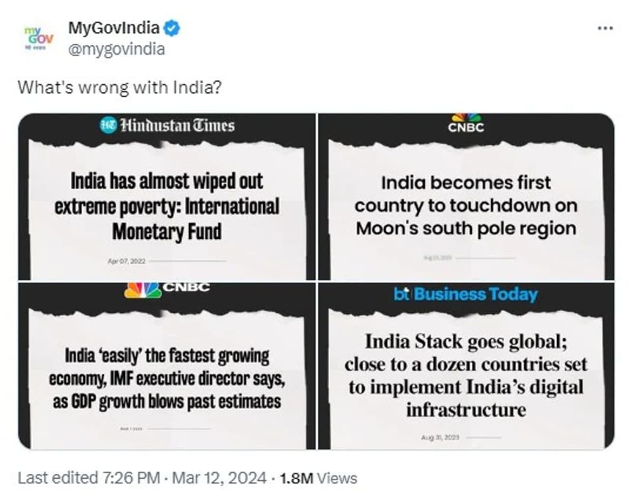ಅಂತಾರಾಷ್ಟ್ರೀಯ ಹಣಕಾಸು ನಿಧಿ ಇತ್ತೀಚೆಗೆ, ಭಾರತ ಕಡುಬಡತನವನ್ನು ಹೆಚ್ಚೂಕಡಿಮೆ ನಿರ್ನಾಮ ಮಾಡಿದೆ ಎನ್ನುವ ಶ್ಲಾಘನೆಯ ಮಾಧ್ಯಮ ಸುದ್ದಿಯನ್ನು ಪೋಸ್ಟ್ ಮಾಡಿದೆ. ಅದರೊಂದಿಗೆ ಚಂದ್ರಯಾನದ ವೇಳೆ ಚಂದ್ರನ ದಕ್ಷಿಣದ ತುದಿಯನ್ನು ತಲುಪಿದ ವಿಶ್ವದ ಮೊಟ್ಟಮೊದಲ ದೇಶ ಎನ್ನುವ ಹೆಮ್ಮೆಯನ್ನು ಪೋಸ್ಟ್ ಮಾಡಿದೆ. ಭಾರತ ವಿಶ್ವದ ಅತ್ಯಂತ ವೇಗವಾಗಿ ಬೆಳೆಯುತ್ತಿರುವ ಆರ್ಥಿಕತೆ ಎಂದು ಐಎಂಎಫ್ ಶ್ಲಾಘನೆಯನ್ನು ಪೋಸ್ಟ್ ಮಾಡಿದೆ. ಅದರೊಂದಿಗೆ ದೇಶದ ಡಿಜಿಟಲ್ ಯಶಸ್ಸಿನ ಕುರಿತಾಗಿ ಈ ಟ್ರೆಂಡ್ನಲ್ಲಿ ವಿಚಾರ ದಾಖಲಿಸಿದೆ.