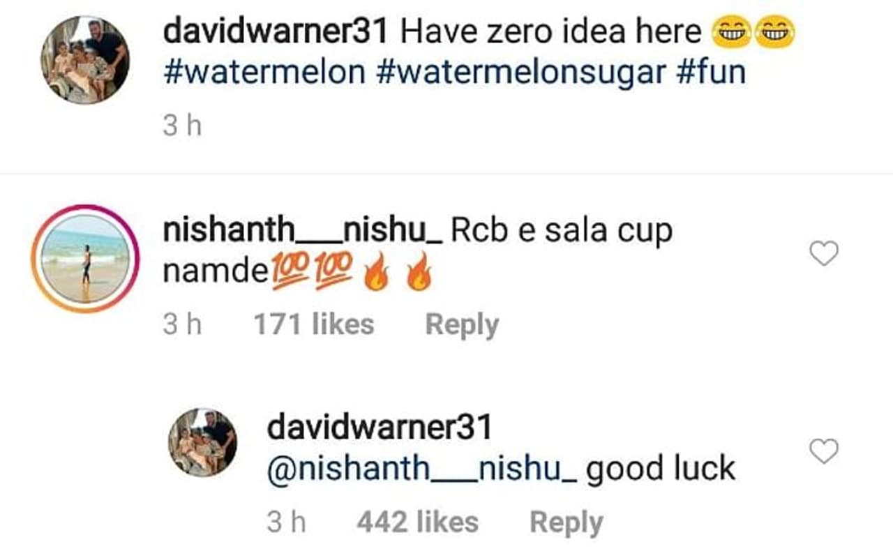 ವಾರ್ನರ್ ಪ್ರಶ್ನೆಗೆ ರಾಯಲ್ ಚಾಲೆಂಜರ್ಸ್ ಬೆಂಗಳೂರು ಅಭಿಮಾನಿ ಈ ಸಲ ಕಪ್ ನಮ್ದೇ ಎಂದು ಕಮೆಂಟ್ ಮಾಡಿದ್ದಾರೆ. ಇದಕ್ಕೆ ತಣ್ಣಗೆ ಪ್ರತಿಕ್ರಿಯಿಸಿರುವ ವಾರ್ನರ್, ಒಳ್ಳೆಯದಾಗಲಿ(ಗುಡ್ ಲಕ್) ಎಂದು ಹೇಳಿದ್ದಾರೆ.