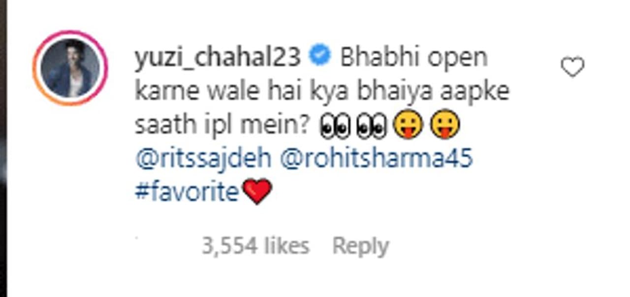 ಈ ವಿಡಿಯೋಗೆ ಪ್ರತಿಕ್ರಿಯಿಸಿರುವ ಆರ್ಸಿಬಿ ಸ್ಪಿನ್ನರ್ ಯಜುವೇಂದ್ರ ಚಹಲ್, ‘ಪತ್ನಿ ಜೊತೆ ಐಪಿಎಲ್ನಲ್ಲಿ ಇನ್ನಿಂಗ್ಸ್ ಆರಂಭಿಸುತ್ತೀರಾ?’ ಎಂದು ರೋಹಿತ್ರ ಕಾಲೆಳೆದಿದ್ದಾರೆ.